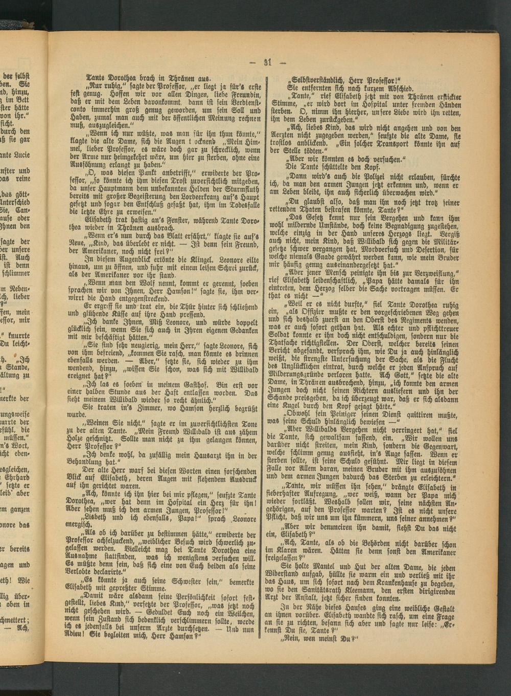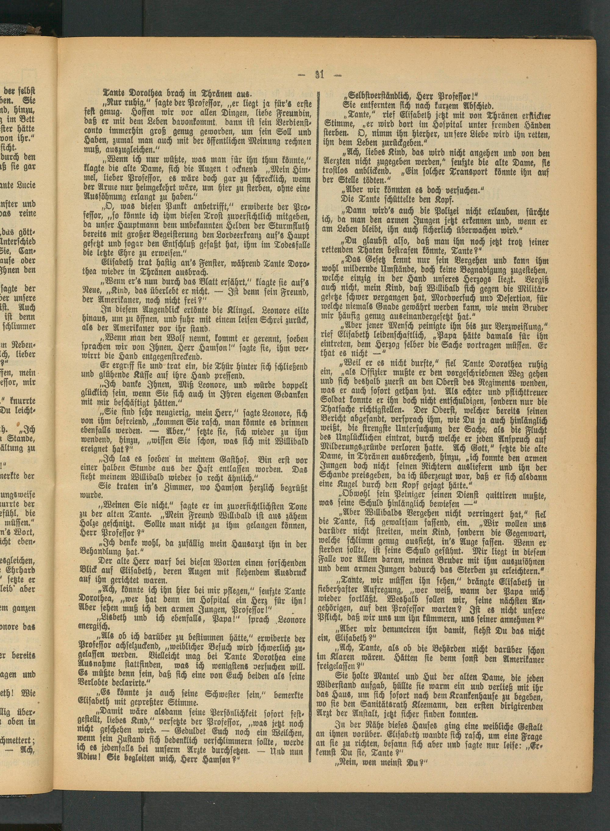Der alte Herr warf bei diesen Worten einen forschenden | Falle vor Allem daran, meinen Bruder mit ihm auszusöhnen Blick auf Elisabeth, deren Augen mit flehendem Ausdruck I unb °em armen Jungen dadurch das Sterben zu erleichtern." auf ihn gerichtet waren. I „Tante, wir müssen ihn sehen," drängte Elisabeth in