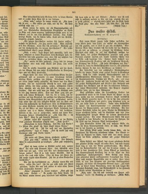 Seit jenem Abend waten sechs Iahte verfloffen, bet junge Mann hatte bem Onkel nie wieder ein Lebenszeichen ( von sich gegeben, und er blieb fo gut wie verschollen. 93er* s schiedene Male schon bemühte sich der Onkel bei der Behörde, l ihn al» tobt zu erklären, er erlangte bie Erfüllung biefes t Wunsches aber nicht, da aus das Checkbuch, welches der § Neffs hatte, bei großen Bankhäusern zuweilen noch große 1 Summen erhoben wurden und damit bewiesen schien, baß | der Neffe noch irgendwo lebe. Immer stand deßhalb vor l bem Cornmetzlenrath Kconberg wie ein furchtbare» Gespenst, ’ bie Drohung be« Neffen: „Ich halte Abrechnung mit Dir." f Er hörte sie, wenn bie Weihnachtsglocken läuteten, mit glühenden i Farben schienen sie ihm vom Christbaum zu leuchten. — I Ein Ueberflnß von den prächtigsten Weihnachtsgaben l bedeckte die langen Tafeln eines großen Saales in Kronberg» Hause. Doch der rechte herzliche Weihnachtsjubel und die glücksstrahlenden Kinderaugen fehlten. Die beiden Töchter des Commerzienraths, Lieschen und Marka, zehn und neun Jahre alt, musterten bereite mit sehr kritischen Blicken und mit großer Selbstgefälligkeit und Eitelkeit ihre Geschenke und tauschten ihre Ansichten aus ob ihre Korallenketten kostbarer, ihre neuen Wintermäntel moderner, ihre Puppen eleganter gekleidet seien, als die ihrer Bekannten.