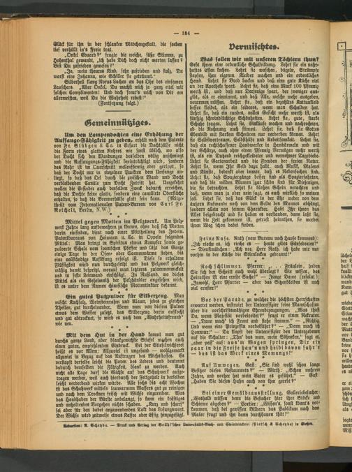 WaS falle« wie mit u«sere« Töchter« thu«? Gebt ihnen eine ordentliche Schulbildung. Lehrt sie ein nahrhaftes Essen kochen. Lehrt sie waschen, bügeln, Strümpfe stopfen, ihre eigenen Kleider machen und ein ordentliches Hemd. Lehrt sie Brod backen und daß eine gute Küche viel an der Apotheke spart- Lehrt sie, daß eine Mark 100 Pfennig werth ist, und daß nur Derjenige spart, der ^weniger ausgibt, als er sinnimmt, und daß Alle, welche mehr ausgeben, verarmen müssen. Lehrt sie, daß ein bezahltes Kattunkleid besser kleidet, als ein seidenes, wenn man Schulden hat. Lehrt sie, daß ein rundes, volles Gesicht mehr werth ist, al» fünfzig schwindsüchtige Schönheiten. Lehrt sie, gute, starke Schuhe tragen. Lehrt sie, Einkäufe machen und nachrechnen, ob die Rechnung auch stimmt. Lehrt sie, daß sie Gottes Ebenbild mit starkem Schnüren nur verderben können. Lehrt sie Selbstvertrauen, Selbsthilfe und Arbeitsamkeit. Lehrt sie, daß ein rechtschaffener Handwerker in Hemdärmeln und mit der Schürze, auch ohne einen Pfennig Vermögen mehr werth ist, als ein Dutzend reichgekleideter und vornehmer Tagediebe. Lehrt sie Gartenarbeit und die Freuden der freien Natur. Lehrt sie, wenn Ihr Geld dazu habt, auch Musik, Malerei und Künste, bedenkt aber immer, daß es Nebensachen sind. Lehrt sie, daß Spaziergänge besser sind als Spazierfahrten, und daß die wilden Blumen !gar schön sind für Diejenigen, dis sie betrachten. Lehrt sie bloßen Schein verachten und daß, wenn man ja oder nein sagt, es auch wirklich so meinen soll. Lehrt sie, daß das Glück in der Ehe weder von dem äußern Aufwande noch von dem Gelds des Mannes abhängt, sondern allein von seinem Charakter. Habt Ihr ihnen das Alles beigebracht und sie haben es verstanden, dann laßt sie, wenn die Zeit gekommen ist, getrost heirathen, sie werben ihren Weg schon dabei finden.