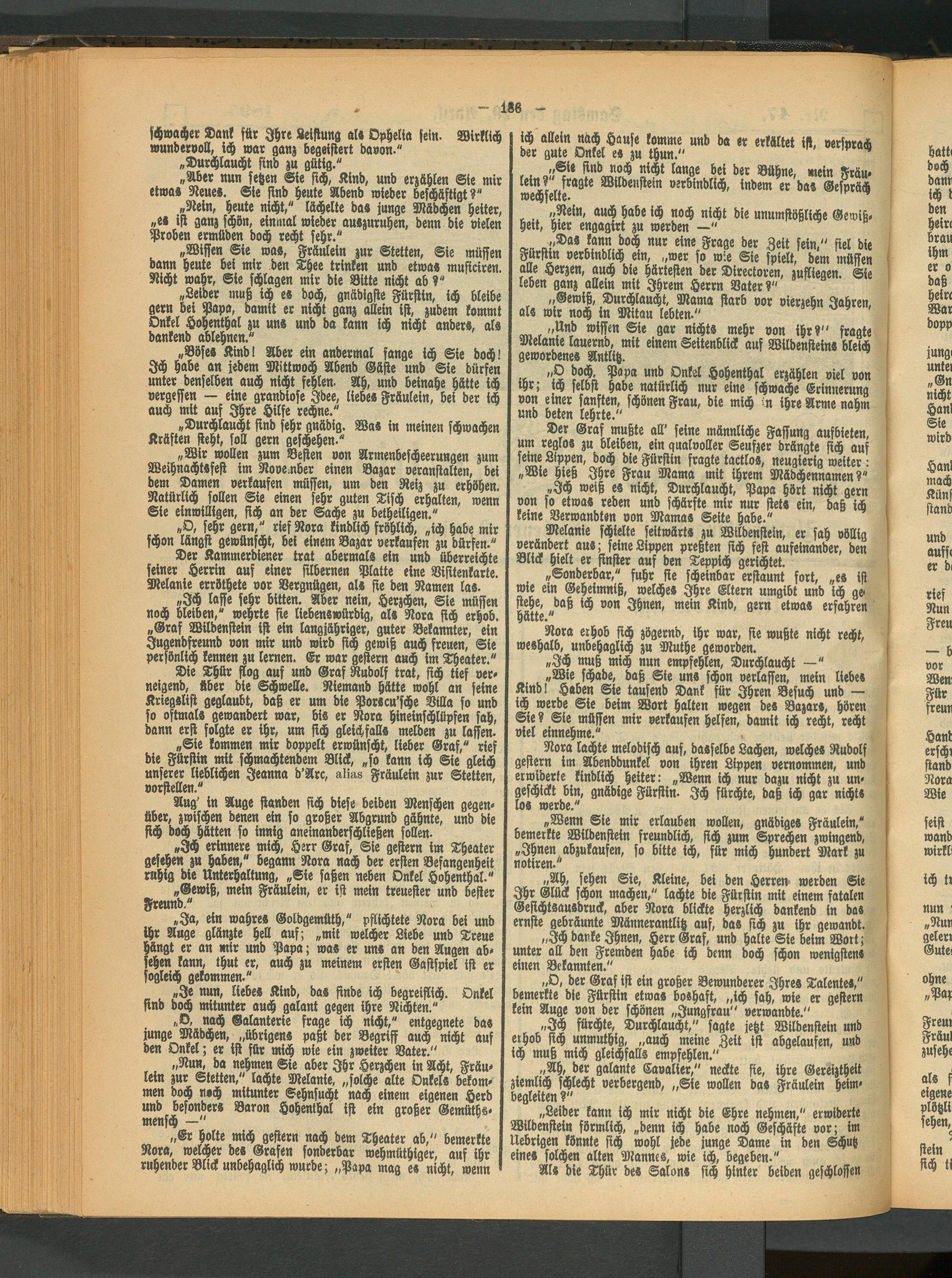 „Ich erinnere mich, Herr Graf, Sie gestern im Theater gesehen zu haben," begann Nora nach der ersten Befangenheit ruhig die Unterhaltung, „Sie saßen neben Onkel Hohenthal."