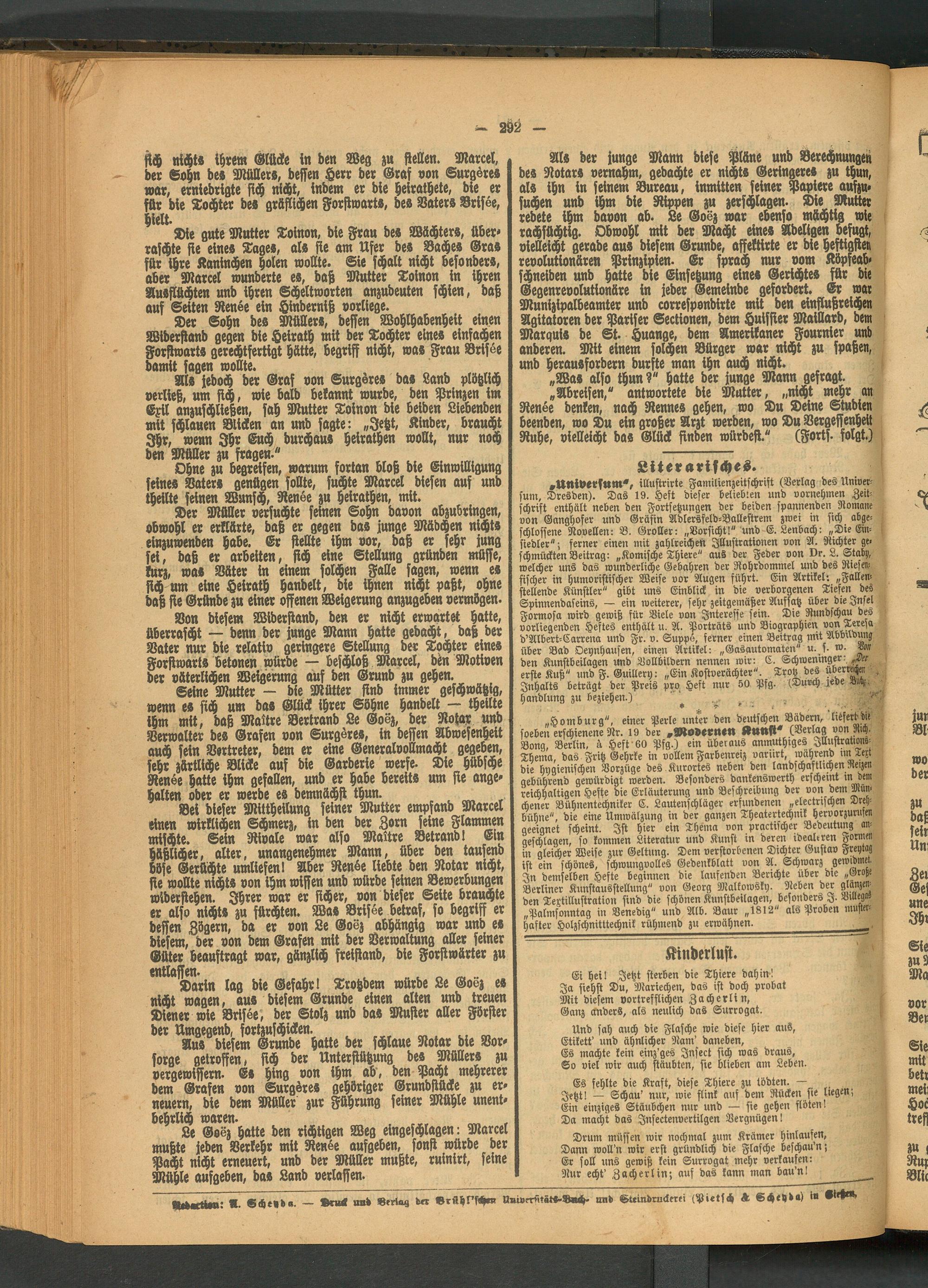 illustrirte Familienzeitschrist (Verlag des Universum, Dresden). Das 19. Heft dieser beliebien und vornehmen Zeitschrift enthält neben den Fortsetzungen der beiden spannenden Romane von Ganghofer und Gräfin Adlersfeld-Ballestrem zwei in sich abgeschlossene Novellen: B. Groller: „Vorsicht!^ und E. Lenbach: „Die Einsiedler"; ferner einen mit zahlreichen Illustrationen von A. Richter geschmückten Beitrag: „Komische Thiere" aus der Feder von Dr. L. Staby, welcher uns das wunderliche Gebühren der Rohrdommel und des Riesm- fischer in humoristischer Weise vor Augen führt. Ein Artikel: „Fallenstellende Künstler" gibt uns Einblick in die verborgenen Tiefen des Spinnendaseins, — ein weiterer, sehr zeitgemäßer Aufsatz über die Insel Formosa wird gewiß für Viele von Interesse sein. Die Rundschau des vorliegenden Heftes enthält u. A. Porträts und Biographien von Tereza d'Albert-Carrena und Fr. v. Supp-', ferner einen Beitrag mit Abbnoung über Bad Oeynhausen, einen Artikel: „Gasautomaten" u. f. w. « den Kunstbeilagen und Vollbildern nennen wir: C. Schweninger „Ar erste Kuß" und F. Guillery: „Ein Kostverächter". Trotz des uberr^tn . Inhalts betrügt der Preis pro Heft nur 50 Pfg. (Durch zede Behandlung zu beziehen.) " *