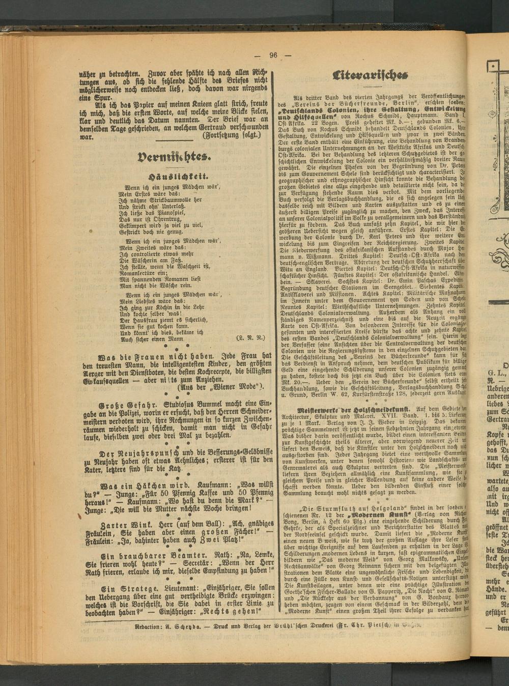 demselben Tage geschrieben, an welchem Gertraud verschwunden I ^uch von Rochus Schmidt behandelt Deutschlands Colonien, ihr« mar (Fortsetzung folgt.) I Gestaltung, Entwickelung und Hilfsquellen und zwar in zwei Bänden. ------------- I Der erste Band enthält eine Einführung, eine Behandlung von Branden-