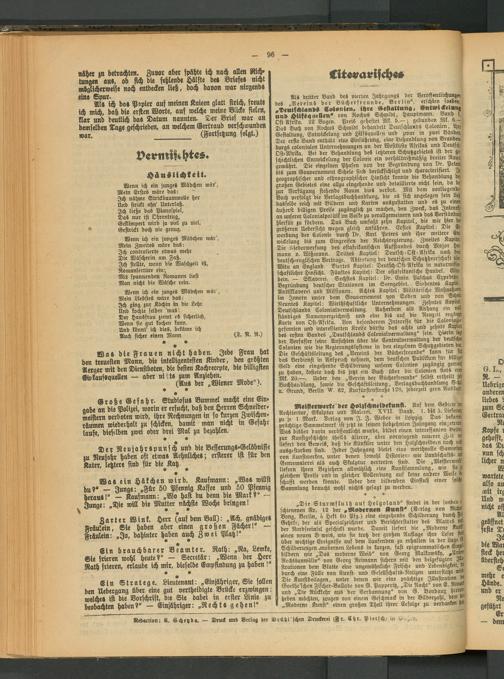 Wenn ich ein junges Mädchen wär, Mein Liebstes wäre das: Ich ging zur Köchin in die Lehr Und lochte selber 'was! Der HauSfrau ziemt eS sicherlich, Wenn sie gut kochen kann. Und könnt' ich dies, bekäme ich Auch sicher einen Mann