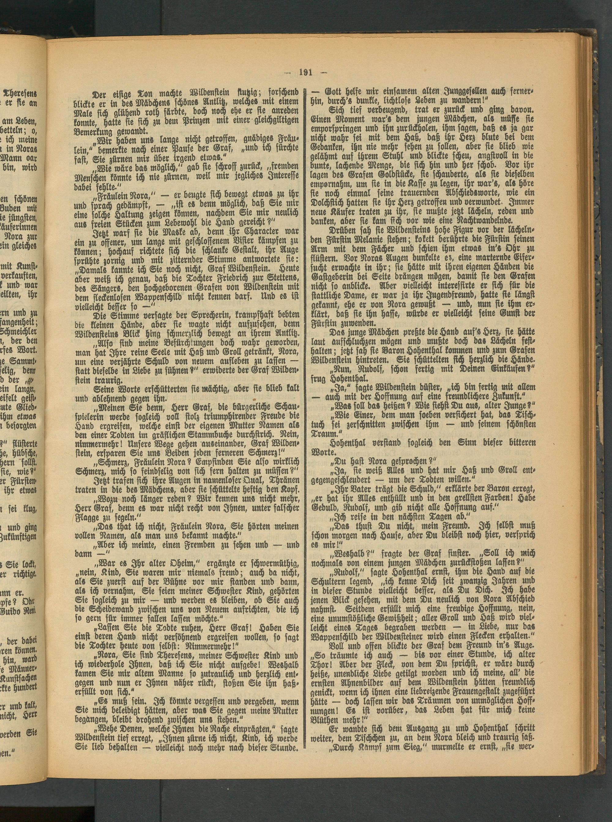 „Rudolf," sagte Hohenthal ernst, ihm die Hand auf die Schultern legend, „ich kenne Dich seit zwanzig Jahren und in dieser Stunde vielleicht beffer, als Du Dich. Ich habe jenen Blick gesehen, mit dem Du neulich von Nora Abschied nahmst. Seitdem erfüllt mich eine freudige Hoffnung, nein, eine unumstößliche Gewißheit; aller Groll und Haß wird vielleicht eines Tages begraben werden — in Liebe, nur das Wappenschild der Wildensteiner wird einen Flecken erhalten."