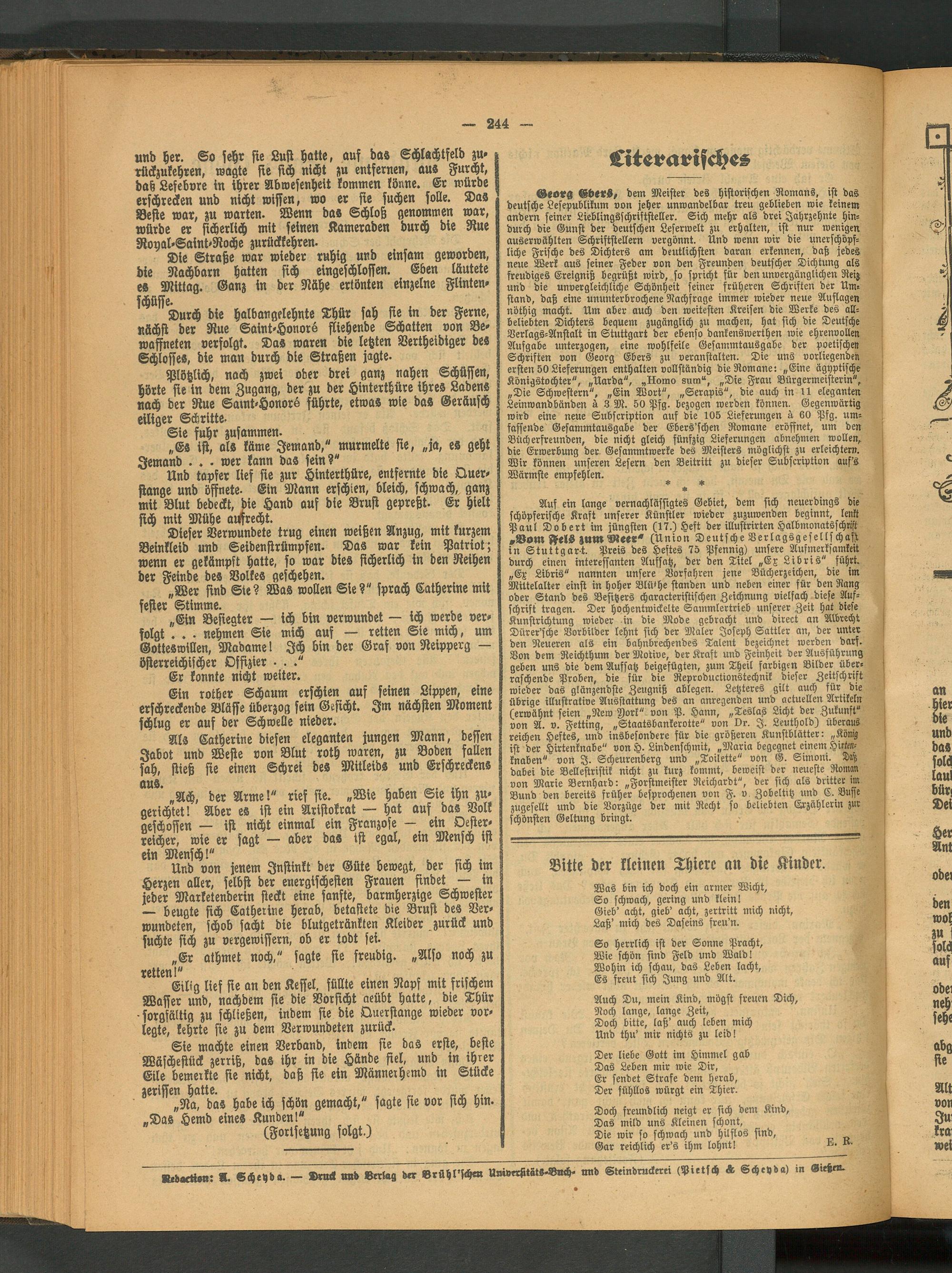 Georg Ebers, dem Meister des historischen Romans, ist das deutsche Lesepublikum von jeher unwandelbar treu geblieben wie keinem andern seiner Lieblingsschriftsteller. Sich mehr als drei Jahrzehnte hindurch die Gunst der deutschen Leserwelt zu erhalten, ist nur wenigen auserwählten Schriftstellern vergönnt. Und wenn wir die unerschöpfliche Frische des Dichters am deutlichsten daran erkennen, daß jedes neue Werk aus seiner Feder von den Freunden deutscher Dichtung als freudiges Ereigniß begrüßt wird, so spricht für den unvergänglichen Reiz und die unvergleichliche Schönheit seiner früheren Schriften der Umstand, daß eine ununterbrochene Nachfrage immer wieder neue Auflagen nöthig macht. Um aber auch den weitesten Kreisen die Werke des allbeliebten Dichters bequem zugänglich zu machen, hat sich die Deutsche Verlags-Anstalt in Stuttgart der ebenso dankenswerthen wie ehrenvollen Aufgabe unterzogen, eine wohlfeile Gesammtausgabe der poetische» Schriften von Georg Ebers zu veranstalten. Die uns vorliegenden ersten 50 Lieferungen mthalten vollständig die Romane: „Eine ägyptische Königstochter", „Uarda", „Homo sum“, „Die Frau Bürgermeisterin", „Die Schwestern", „Ein Wort", „Serapis", die auch in 11 eleganten Leinwandbänden ü 3 M. 50 Pfg. bezogen werden können. Gegenwärtig wird eine neue Subscription auf die 105 Lieferungen ä 60 Pfg. umfassende Gesammtausgabe der Ebers'schen Romane eröffnet, um den Bücherfreunden, die nicht gleich fünfzig Lieferungen abnehmen wollen, die Erwerbung der Gesammtwerke des Meisters möglichst zu erleichtern. Wir können unseren Lesern den Beitritt zu dieser Subscription auf's Wärmste empfehlen. *