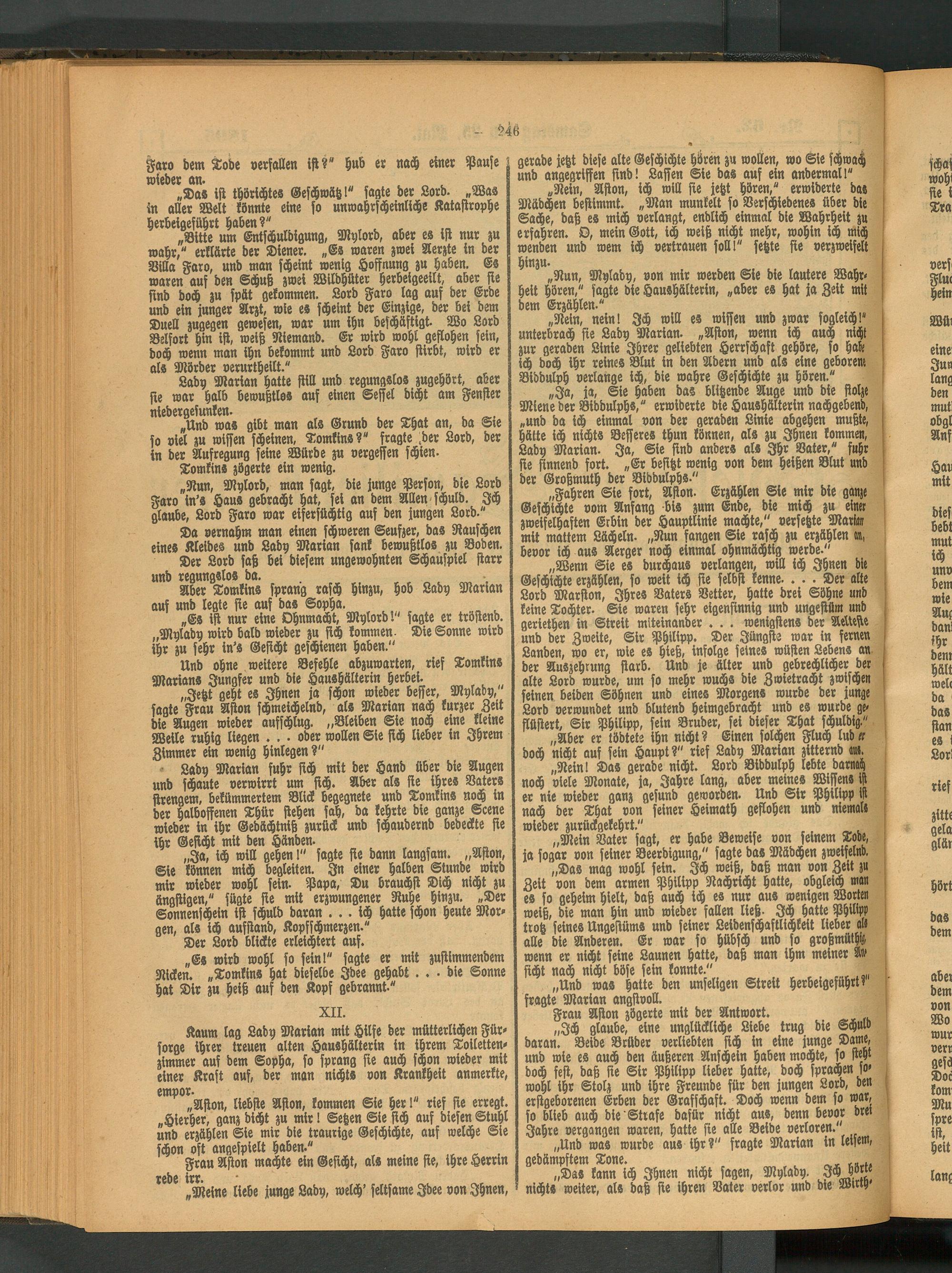 „Wenn Sie es durchaus verlangen, will ich Ihnen die Geschichte erzählen, so weit ich sie selbst kenne- ... Der alte Lord Marston, Ihres Vaters Vetter, hatte drei Söhne und keine Tochter. Sie waren sehr eigensinnig und ungestüm und geriethen in Streit miteinander . . . wenigstens der Arlichr und der Zweite, Sir Philipp. Der Jüngste war in fernen Landen, wo er, wie es hieß, infolge feines wüsten Lebens an der Auszehrung starb. Und je älter und gebrechlicher der alte Lord wurde, um so mehr wuchs die Zwietracht zwischen seinen beiden Söhnen und eines Morgens wurde der junge Lord verwundet und blutend heimgebracht und es wurde geflüstert, Sir Philipp, sein Bruder, sei dieser That schuldig."