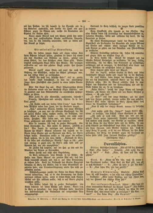 Der Müller befand fich in großer Verlegenheit: sein Sohn beharrte bei seiner Abstcht und schwur, Renöe trotz Le Go8z zu heirathen; da» junge Mädchen hatte ihrerseits den Liebesanträgen des Verwalters ein categorische« Nein entgegengesetzt.
