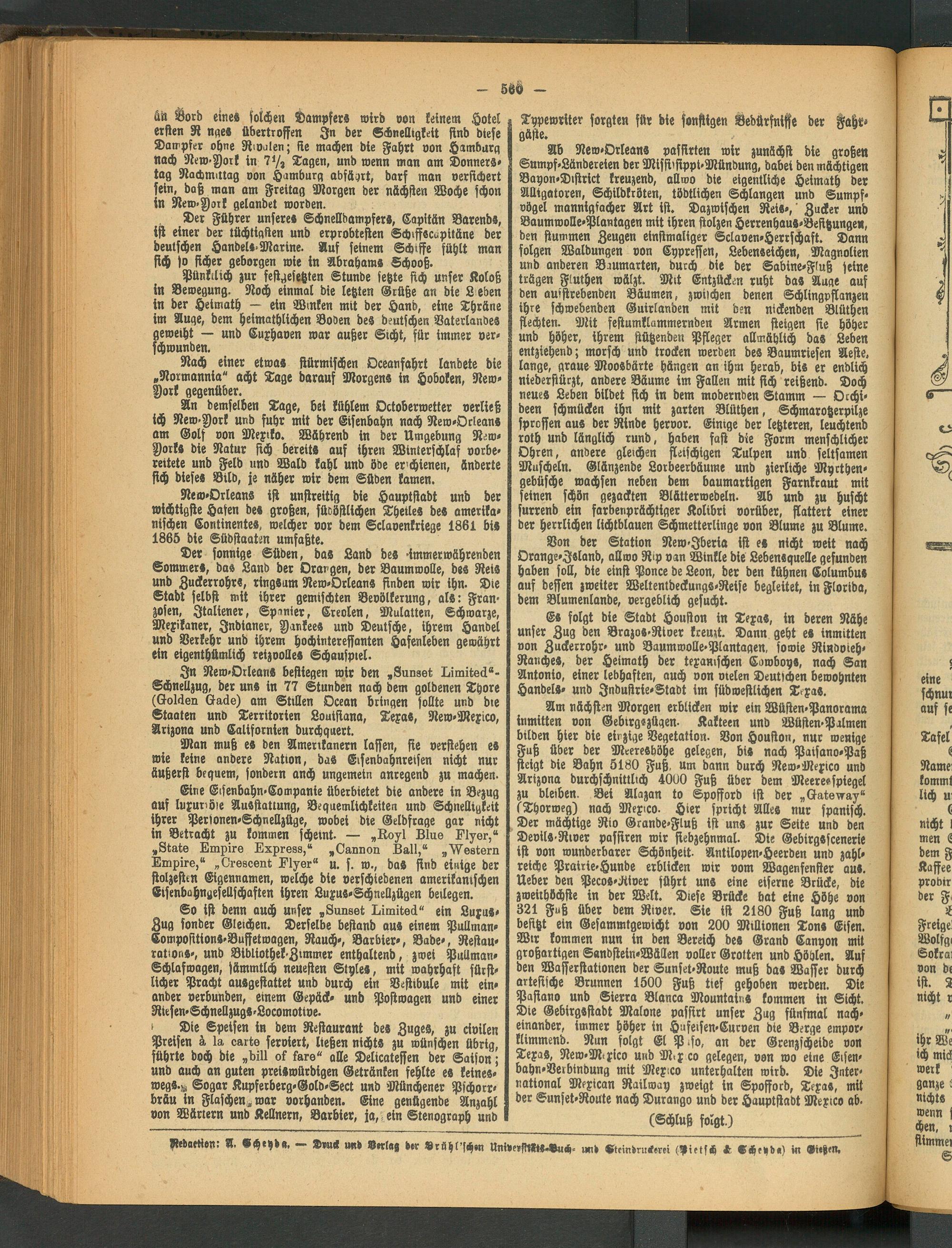 In New-Orleans bestiegen wir den „Sunset Limited“- Schnellzug, der uns in 77 Stunden nach dem goldenen Thore (Golden Gade) am Stillen Ocean bringen sollte und die Staaten und Territorien Louisiana, Texas, New-Mexico, Arizona und (Kalifornien durchquert.