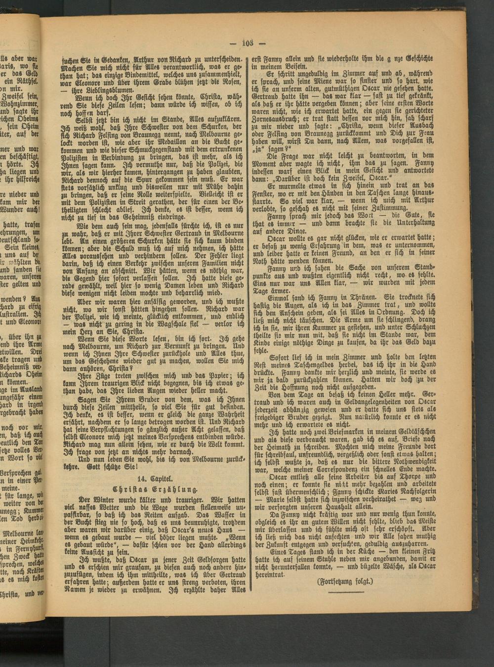 Wie dem auch fein mag, jedenfalls fürchte ich, ist es nur zu wahr, daß er mit Ihrer Schwester Gertraud in Melbourne lebt. An einen größeren Schurken hätte sie sich kaum binden können; aber die Schuld muß ich auf mich nehmen, ich hätte Aller voraussehen und verhindern sollen. Der Fehler liegt darin, daß ich einen Verkehr zwischen unseren Familien nicht von Anfang an abschnitt. Wir hätten, wenn es nöthig war, die Gegend hier sofort verlassen sollen. Ich hatte diese gerade gewählt, weil hier so wenig Damen leben und Richard diese wenigen nicht leiden mochte und beharrlich mied.