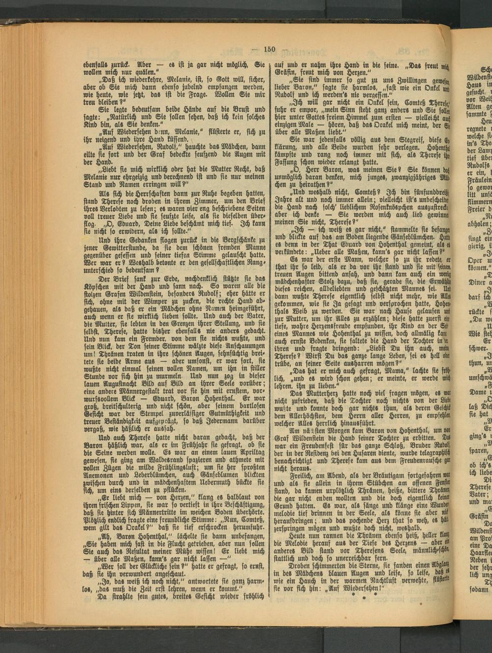 Am nässten Morgen kam Baron von Hohenthal, um von Graf Wildenstein die Hand feiner Tochter zu erbitten. Dai war ein Freudenfest für das ganze Schloß, Bruder Rudolf der in der Residenz bei den Husaren diente, wurde telegraphisch benachrichtigt und Therese kam aus dem Freudenräusche gai nicht heraus.