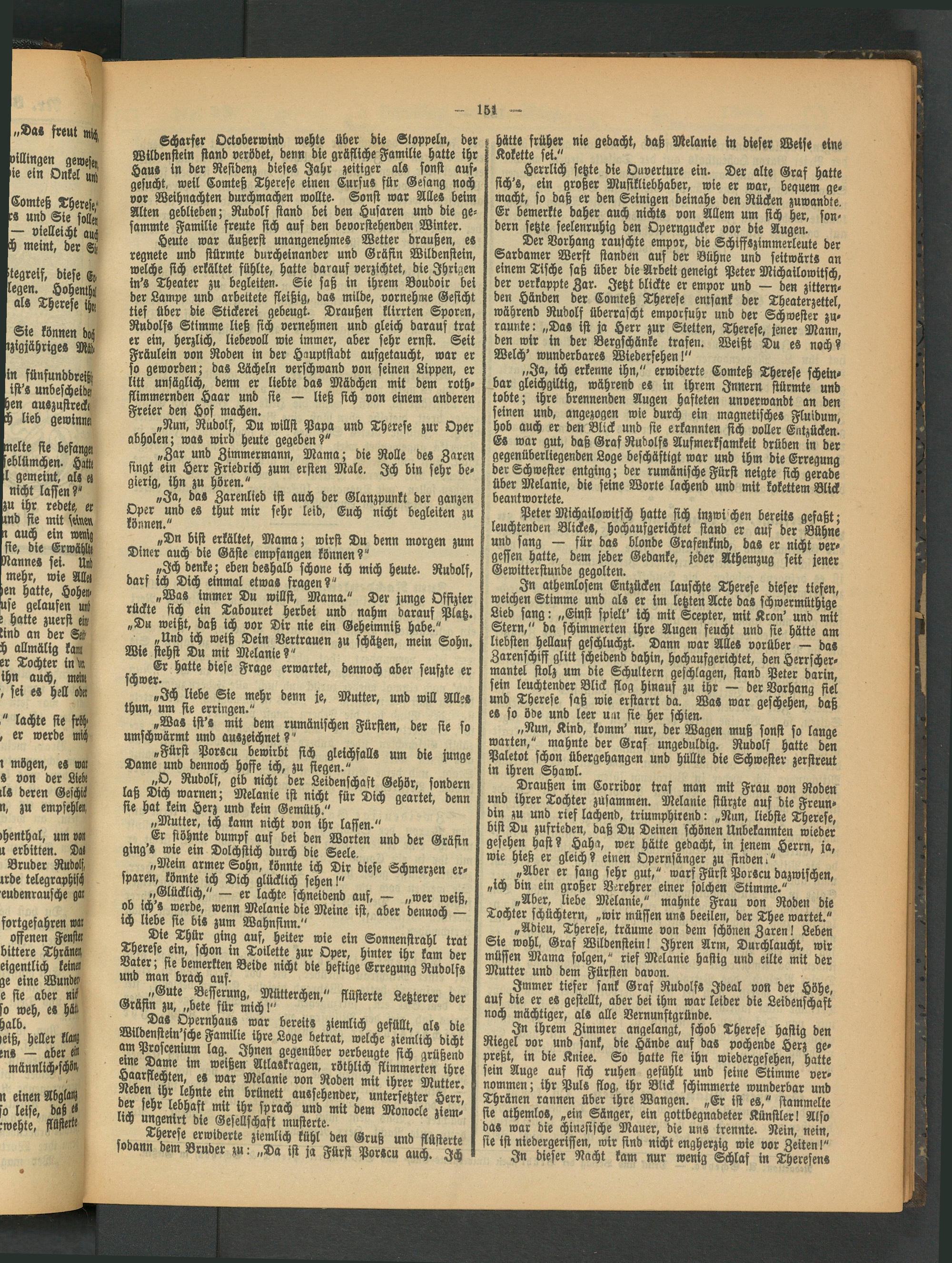 „Ja, ich erkenne ihn," erwiderte Comteß Therese scheinbar gleichgiltig, während er in ihrem Innern stürmte und tobte; ihre brennenden Augen hafteten unverwandt an den seinen und, angezogen wie durch ein magnetisches Fluidum, hob auch er den Blick und sie erkannten sich voller Entzücken.' Es war gut, daß Graf Rudolfs Aufmerksamkeit drüben in der gegenüberliegenden Loge beschäftigt war und ihm die Erregung der Schwester entging; der rumänische Fürst neigte sich gerade über Melanie, die seine Worte lachend und mit kokettem Blick beantwortete.