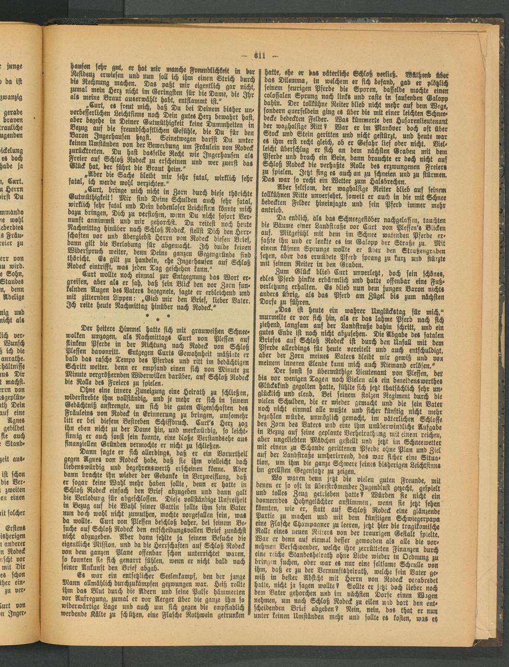 Dann sagte er sich allerding«, daß er ein Vorurtheil gegen Agne» von Rodeck habe, daß sie ihm vielleicht doch liebenswürdig und begehrenswerth erscheinen könne. Aber bann brachte ihn wieder der Gedanke in Verzweiflung, daß er sogar keine Wahl mehr haben sollte, denn er hatte in Schloß Rodeck einfach den Brief abzugeben und dann galt die Verlobung für abgeschlossen. Diese vollständige Unfreiheit in Bezug auf die Wahl seiner Gattin sollte ihm sein Vater nun doch wohl nicht zumuthen, mochte vorgefallen sein, was da wollte. Curt von Plessen beschloß daher, bei seinem Be- suche auf Schloß Rodeck den entscheidungsvollen Brief zunächst nicht abzugeben. Aber dann fehlte ja seinem Besuche die eigentliche Mission, und da die Herrschaften auf Schloß Rodeck von dem ganzen Plan« offenbar schon unterrichtet waren, so konnten sie sich genarrt fühlen, wenn er nicht bald nach seiner Ankunft den Brief abgab.