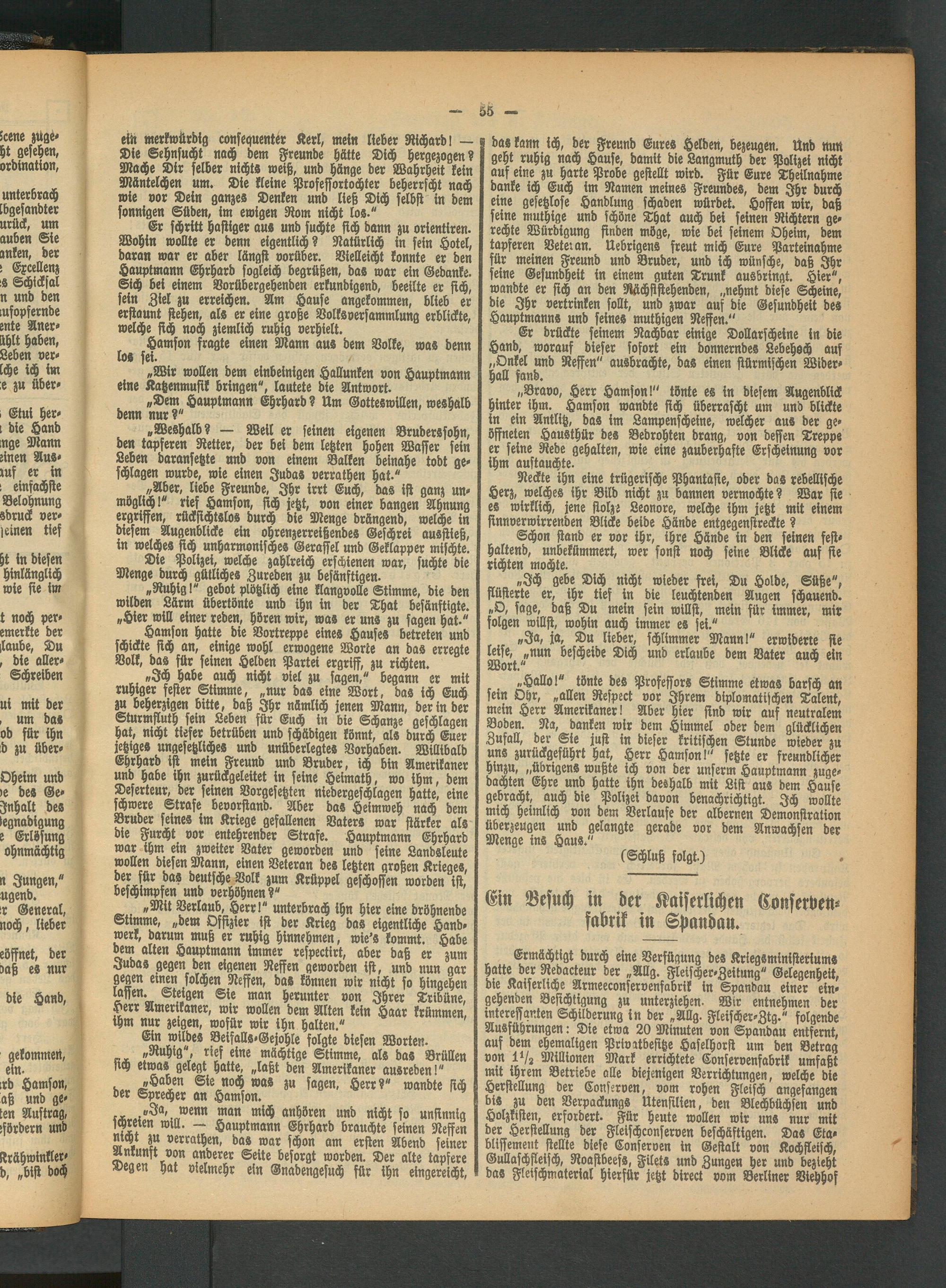 Ermächtigt durch eine Verfügung des Kriegsministeriums hatte der Redacteur der „Allg. Fleischer-Zeitung" Gelegenheit, die Kaiserliche Armeeconservenfabrik in Spandau einer eingehenden Besichtigung zu unterziehen. Wir entnehmen der interessanten Schilderung in der „Allg. Fleischer-Ztg." folgende Ausführungen: Die etwa 20 Minuten von Spandau entfernt, auf dem ehemaligen Privatbesitze Haselhorst um den Betrag von 1V3 Millionen Mark errichtete Conservenfabrik umfaßt mit ihrem Betriebe alle diejenigen Verrichtungen, welche die Herstellung der Conserven, vom rohen Fleisch angefangen bis zu den Verpackungs Utensilien, den Blechbüchsen und Holzkisten, erfordert. Für heute wollen wir uns nur mit der Herstellung der Fleischconferven beschäftigen. Das Eta- blissemeut stellte diese Conserven in Gestalt von Kochfleisch, Gullaschfleisch, Roastbeefs, Filets und Zungen her und bezieht das Fleischmaterial hierfür jetzt direct vom Berliner Viehhof
