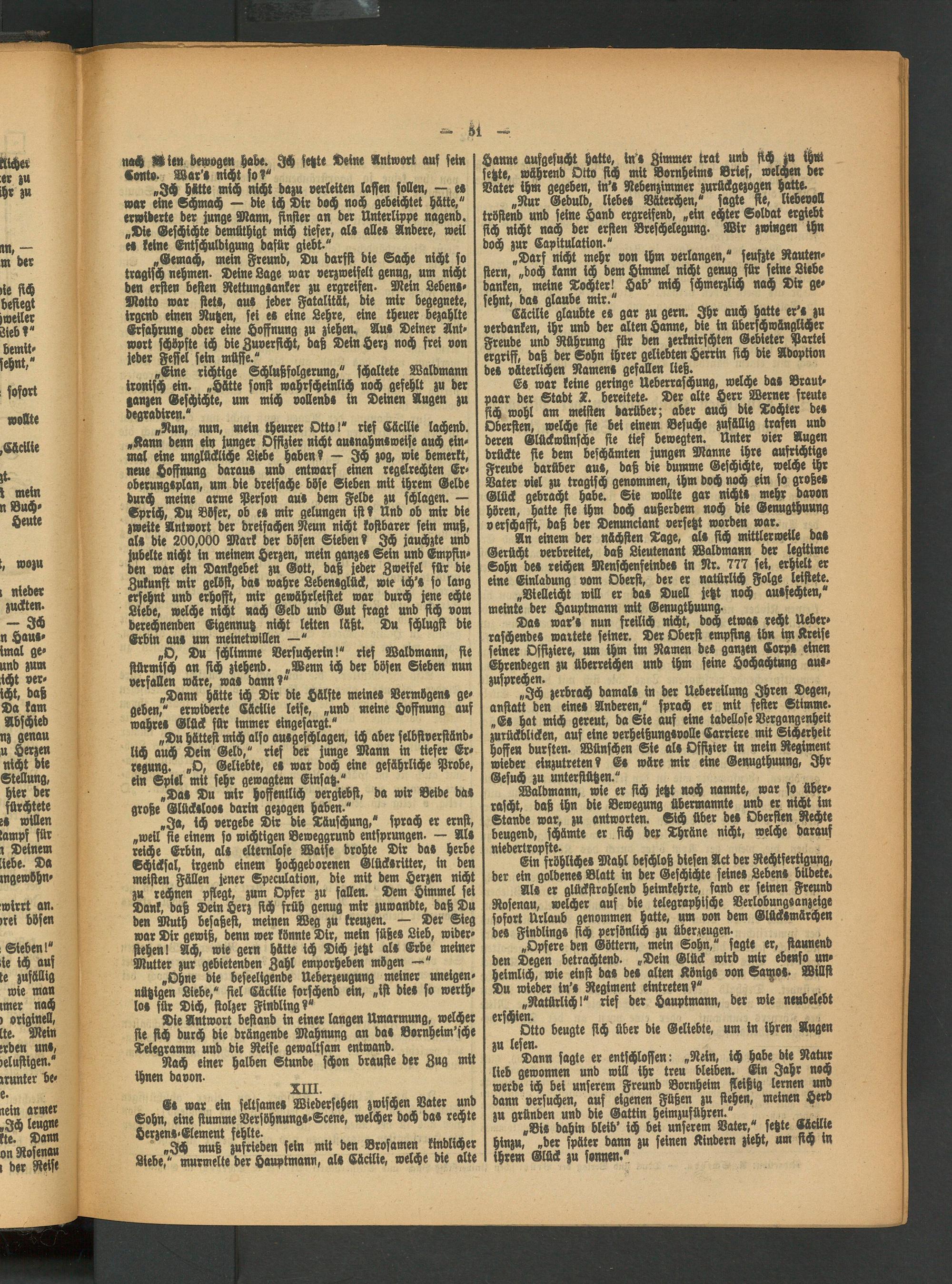 An einem der nächsten Tage, al« sich mittlerweile da« Gerücht verbreitet, daß Lieutenant Waldmann der legitime Sohn de« reichen Menschenfeinde« in Nr. 777 fei, erhielt er eine Einladung vom Oberst, der er natürlich Folge leistete.