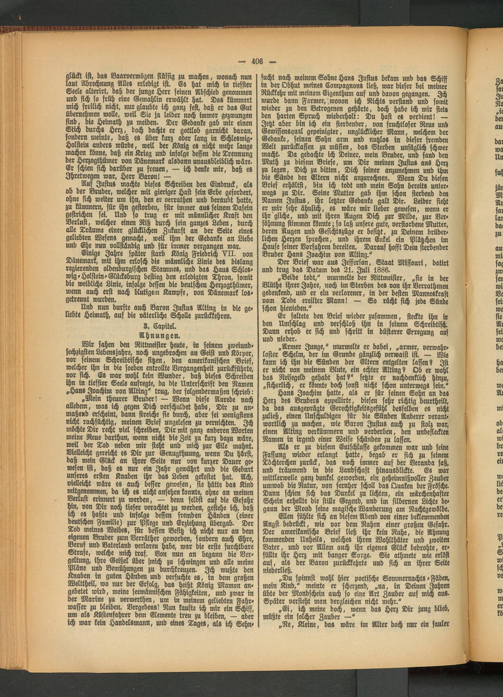 «Mein theurer Bruder! — Wenn diese Anrede nach alledem, was ich gegen Dich verschuldet habe, Dir zu anmaßend erscheint, dann streiche sie durch, aber sei wenigstens nicht rachsüchtig, meinen Brief ungelesen zu vernichten. Ich möchte Dir recht viel schreiben, Dir mit ganz anderen Worten meine Reue darthun, wenn nicht die Zeit zu kurz dazu wäre, well der Tod neben mir steht und mich zur Eile mahnt. Vielleicht gereicht es Dir zur Genugthuung, wenn Du hörst, daß mein Glück an ihrer Seite nur von kurzer Dauer gewesen ist, daß es nur ein Jahr gewährt und die Geburt unseres ersten Knaben ihr das Leben gekostet hat. Ach, vielleicht wäre es auch besser gewesen, sie hätte das Kind mitgenommen, da ich es nicht ansehsn konnte, ohne an meinen Verlust erinnert zu werden, — denn selbst auf die Gefahr hin, von Dir noch tiefer verachtet zu werden, gestehe ich, daß ich es haßte und infolge dessen fremden Händen (einer deutschen Familie) zur Pflege und Erziehung übergab. Der Tod meines Weibes, für dessen Besitz ich nicht nur an dem eigenen Bruder zum Verräther geworden, sondern auch Ehre, Beruf und Vaterland verloren habe, war die erste furchtbare Strafe, welche mich traf. Von nun an begann die Veraltung, ihre Geißel über smich zu schwingen und alle meine Pläne und Bemühungen zu durchkreuzen. Ich wußte den Knaben in guten Händen und versuchte es, in dem großen Welttheil, wo nur der Erfolg, das heißt König Mamon angebetet wird, meine seemännischen Fähigkeiten, und zwar in der Marine zu verwerthen, um in meinem geliebten Fahrwasser zu bleiben. Vergebens! Nun kaufte ich mir ein Schiff, um als Küstenfahrer dem Elemente treu zu bleiben, — aber ich war kein Handelsmann, und eines Tages, als ich Sehn