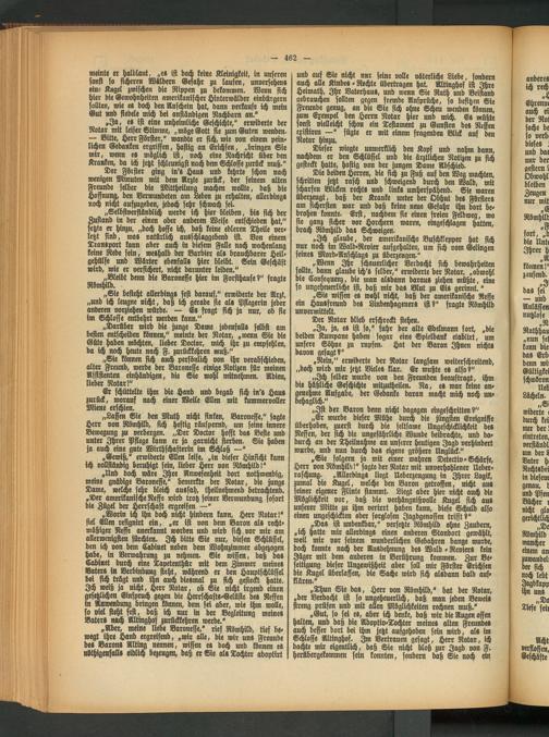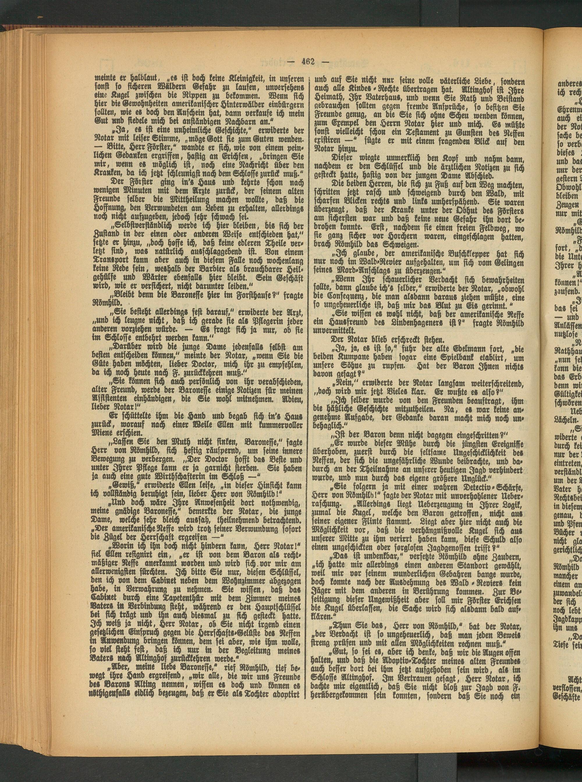 „Und doch wäre Ihre Anwesenheit dort nothwendig, meine gnädige Baronesse," bemerkte der Notar, die junge Dame, welche sehr bleich aussah, theilnehmend betrachtend. „Der amerikanische Neffe wird trotz seiner Verwundung sofort die Zügel der Herrschaft ergreifen —"