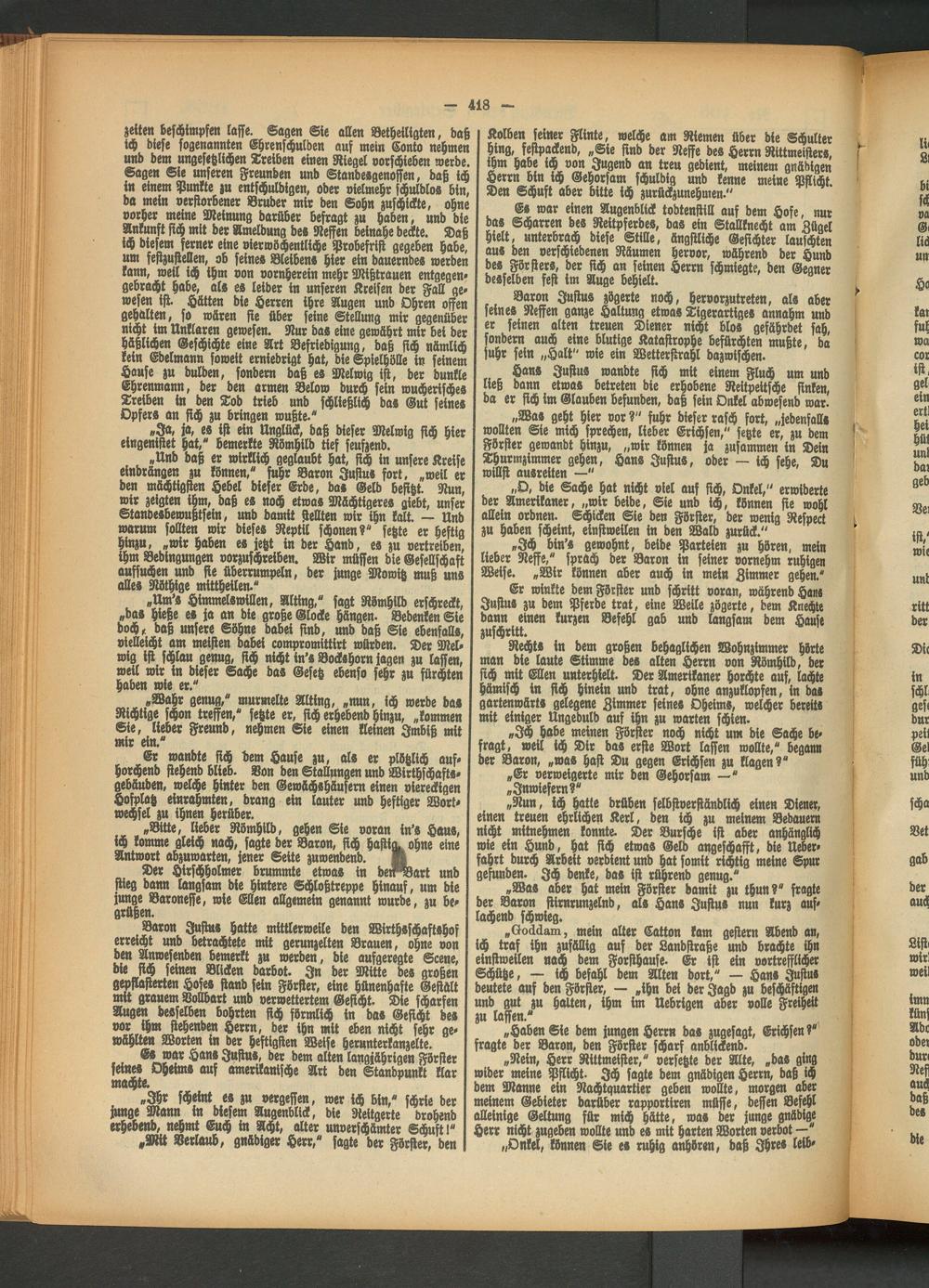 „O, die Sache hat nicht viel auf sich, Onkel," erwiderte der Amerikaner, „wir beide, Sie und ich, können sie wohl allein ordnen. Schicken Sie den Förster, der wenig Respect zu haben scheint, einstweilen in den Wald zurück."