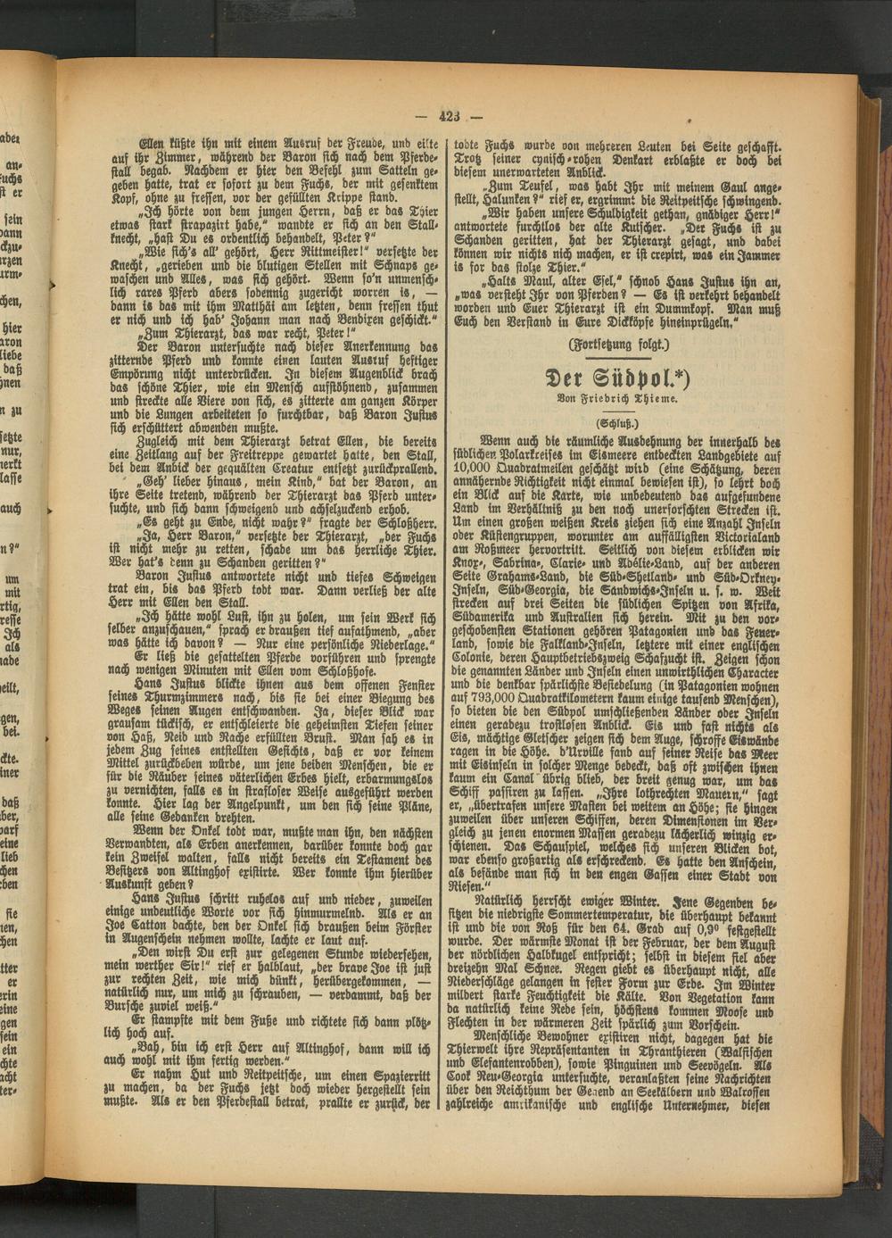 Ellen küßte ihn mit einem Ausruf der Freude, und eilte auf ihr Zimmer, während der Baron sich nach dem Pferdestall begab. Nachdem er hier den Befehl zum Satteln gegeben hatte, trat er sofort zu dem Fuchs, der mit gesenktem Kopf, ohne zu fressen, vor der gefüllten Krippe stand.