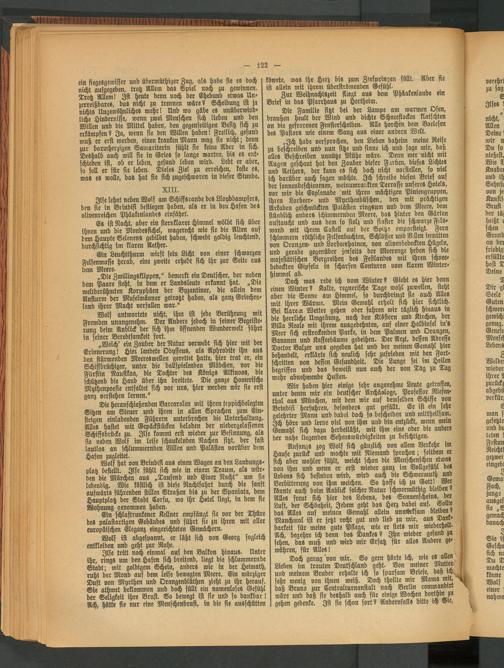 Doch was rede ich vom Winter? Giebt es hier denn einen Winter? Kalte, regnerische Tage wohl zuweilen, steht aber die Sonne am Himmel, so durchdringt sie auch Alles mit ihrer Wärme. Mein Gemahl erholt sich hier sichtlich. Bei klarem Wetter gehen oder fahren wir täglich hinaus in die herrliche Umgebung, nach den Klöstern und Kirchen, der Villa Reale mit ihrem ausgedehnten, auf einer Halbinsel in'» Meer sich erstreckenden Parke, in dem Palmen und Orangen, I Bananen und Kaffeebäume gedeihen. Der Arzt, deffen Adreffe Doctor Balzer uns gegeben hat und der meinen Gemahl hier behandelt, erklärte sich neulich sehr zufrieden mit den Fort- schritten von deffen Gesundheit. Die Lunge sei im Heilen begriffen und das beweist nun auch der von Tag zu Tag mehr abnehmende Husten.