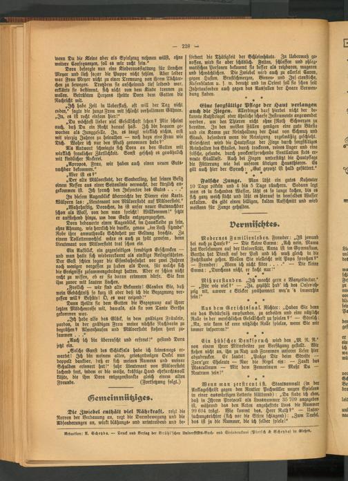 Eine sorgfältige Pflege der Haut verlanget» auch die Ziegen. Allerdings darf hierbei nicht der bekannte Kuhstriegel oder ähnliche scharfe Instrumente angewendet werden, um den Thieren nicht ohne jNoth Schmerzen zu bereiten. Ja den meisten Fällen genügen eine gute Bürste und ein Kamm zur Reinhaltung der Haut von Schmutz und Staub, besonders wenn die Reinigung regelmäßig geschieht. Erleichtert wird die Hautpflege der Ziege durch sorgfältiges Reinhalten des Stalles, durch trockene«, reines Lager und eine frische, gesunde, durch zweckentsprechende Ventilation stets erneute Stallluft. Auch bei Ziegen unterstützt die Hautpflege die Fütterung wie bei unseren übrigen Hausthieren. Es gilt auch hier der Spruch: „Gut geputzt ist halb gefüttert."