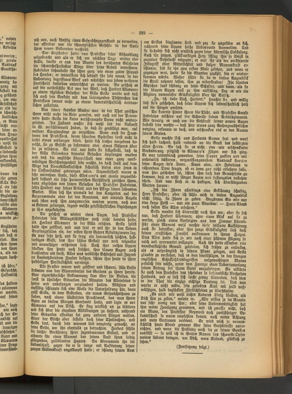 Erika wandte sich überrascht nach ihm um; aber sie sah nur, daß Herbert Ellesmere, ohne einen Blick auf sie zu werfen, gleich einem Verfolgten aus dem Zimmer stürmte. | Mr einen Moment wohl machte diese seltsame Aufführung auch sie betroffen; aber ihre junge Glückseligkeit ließ doch keinen ernstlichen Zweifel auskommen in ihrem Herzen. Dies Alles' hatte sich ja wie nach einer höheren Fügung so rasch und unerwartet vollzogen. Auch ihn hatte offenbar eine nnwiderstehliche Gewalt getrieben, sich früher zu entdecke», als es ursprünglich in seinem Plane gelegen, und Erika glaubte zu verstehen, daß es dem feinfühligen, in den strengen englischen Schicklichkeitsbegriffen ausgewachsenen Manne peinlich sein müsse, unter dem Zwange einer Ueberrumpelung seinen Antrag bei ihrem Vater vorzubringen. So erklärte sie auch dem Professor das scheinbar so befremdliche Verhalten Herbert», und er ließ sich leicht genug überreden, daß dies in der That die einzige richtige Deutung sei. Und nun wurde er nicht müde, sein geliebter Kind mit halb web- müthigen, halb beglückten Zärtlichkeiten zu überhäufen.