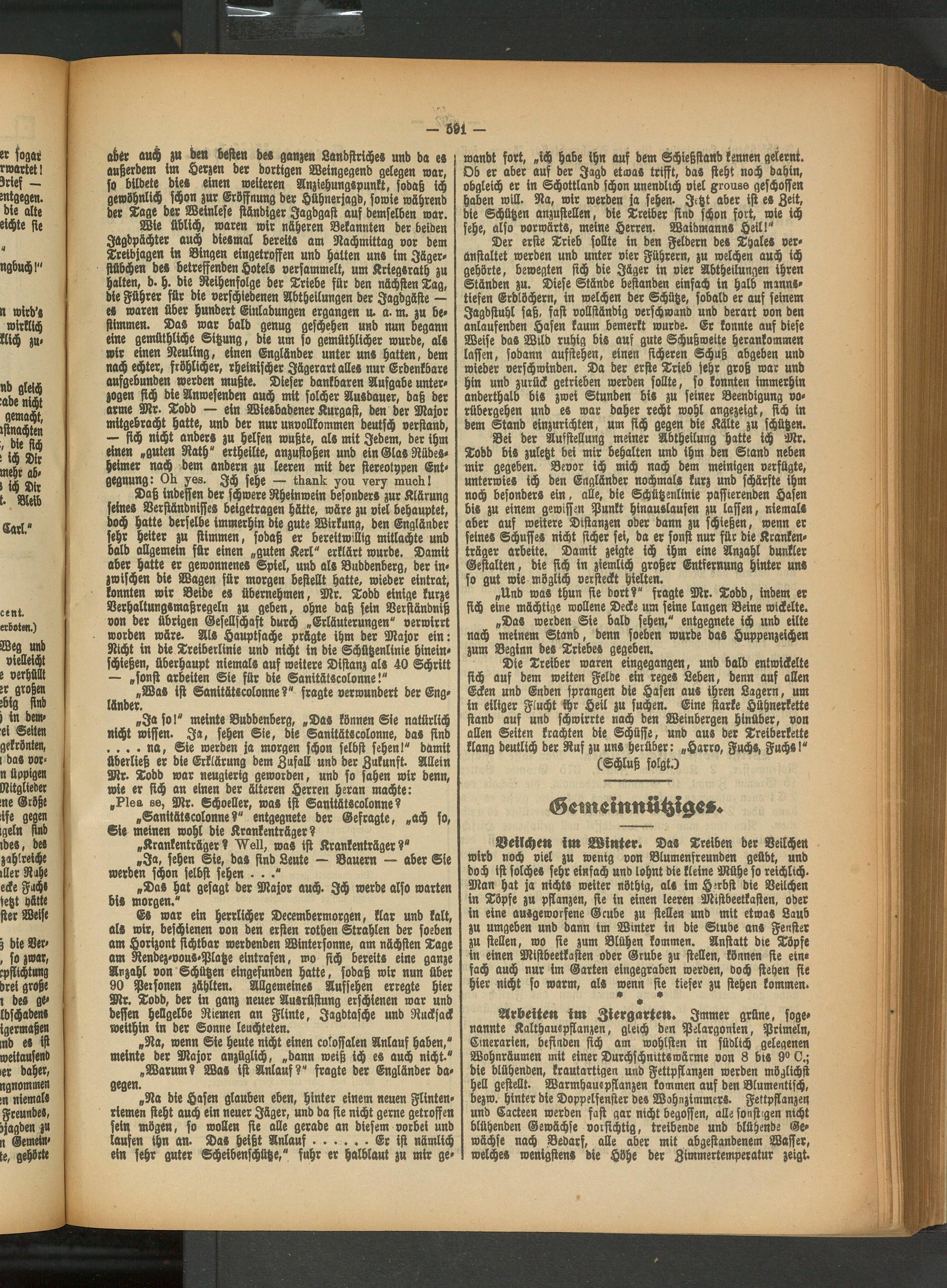 Daß indessen der schwere Rheinwein besonders zur Klärung seines Verständnisses beigetragen hätte, wäre zu viel behauptet, doch hatte derselbe immerhin die gute Wirkung, den Engländer sehr heiter zu stimmen, sodaß er bereitwillig mitlachte und bald allgemein für einen „guten Kerl" erklärt wurde. Damit aber hatte er gewonnenes Spiel, und als Buddenberg, der inzwischen die Wagen für morgen bestellt hatte, wieder eintrat, konnten wir Beide es übernehmen, Mr. Todd einige kurze Verhaltungsmaßregeln zu geben, ohne daß fein Verständniß von der übrigen Gesellschaft durch „Erläuterungen" verwirrt worden wäre. Als Hauptsache prägte ihm der Major ein: Nicht in die Treiberltnie und nicht in die Schützenlinie hinein- schießen, überhaupt niemals auf weitere Distanz als 40 Schritt — „sonst arbeiten Sie für die Sanitätscolonne!"