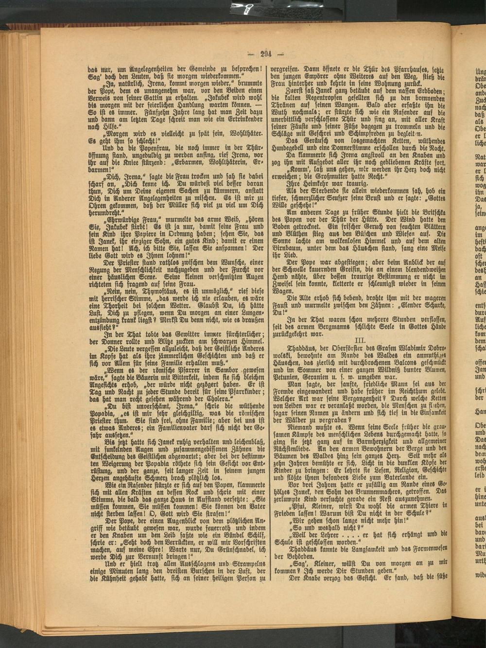 „Wenn e» der römische Pfarrer in Sambor gewesen wäre," sagte die Bäuerin mit Bitterkeit, indem fie sich bleichen Angesicht» erhob, „der würde nicht gezögert haben. Er ist Tag und Nacht zu jeder Stunde bereit für seine Pfarrkinder; da« hat man recht gesehen während der Cholera."