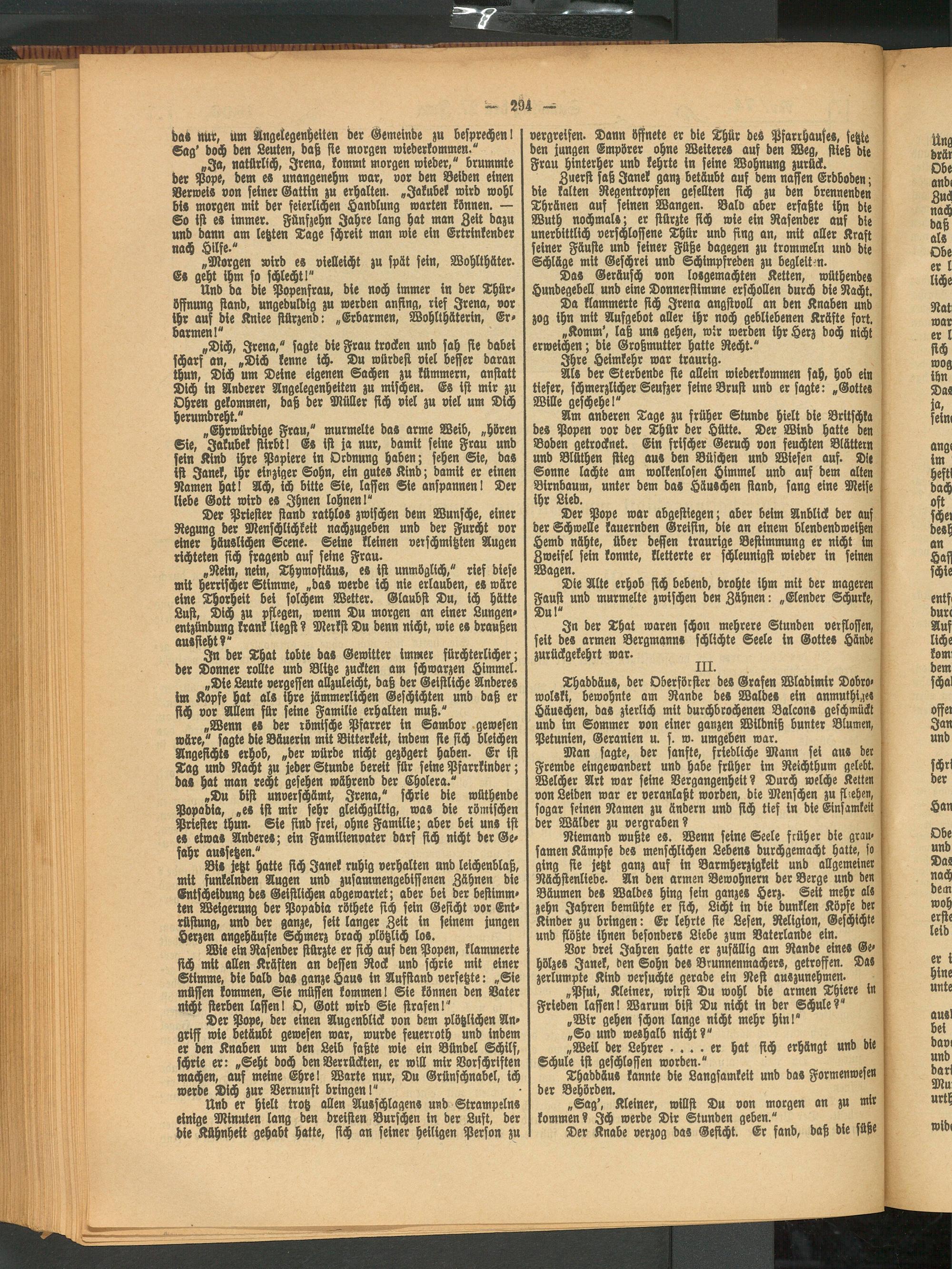Bi» jetzt hatte sich Janek ruhig verhalten and leichenblaß, mit funkelnden Augen und zusammengebiflsnen Zähnen die Entscheidung de» Geistlichen abgewartet; aber bei der bestimmten Weigerung der Popadia röthete sich sein Gesicht vor Entrüstung, und der ganze, seit langer Zeit in seinem jungen Herzen angehäufte Schmerz brach plötzlich los.