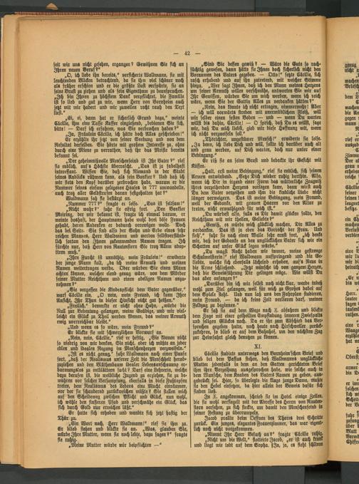 Cäcilie studirte unterwegs den Bomheim'schen Brief und blieb bei dem Passus stehen, daß Waldmanns unglückliche Mutter jedenfalls in dem an den Gatten gerichteten Brief ihm ihre Verzeihung ausgesprochen habe, wie solche auch in dem Wunsche, dem Knaben des Vaters Namen zu geben, ausgedrückt sei. Hier, so Überlegte die kluge junge Dame, mußte sie den Hebel einsetzen, da hier allein der Beweis dafür sich finden ließ.