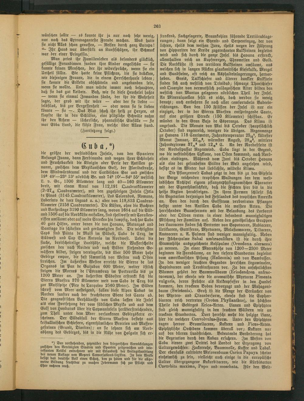 die größte der westindischen Inseln, von den Spaniern Anfangs Juana, dann Ferdinanda und wegen ihrer Schönheit und Fruchtbarkeit die Königin oder Perle der Antillen genannt, zwischen dem Mexikanischen Golf, der Floridastraße, dem Windwärtscanal und der Caribischen See und zwischen 19« 49'—23° 13' nördlich Br. und 74« 10'-84« 55' westlich L. v. Gr-, 1300 Kilometer lang und 40—160 Kilometer breit, mit einem Areal von 112,191 Quadratkilometer (2037,5 Quadratmeter), mit den zugehörigen Inseln (Isla de Pinos (3145 Quadratkilometer), Los Colorados, Romano, Laberinto de doce Leguas u. a.) aber von 118,833 Quadratkilometer (2158 Quadratmeter). Die Küsten, ohne die Buchten und Vorsprünge 3190 Kilometer lang, wovon 1684 auf die Süd- und 1506 auf die Nordküste entfallen, sind theilweise mit Corallen- riffen umsäumt oder auf weite Strecken hin sumpfig, doch hat Cuba 40 gute Häfen, unter denen die von Havana, Matanzas und Santiago die schönsten und geräumigsten sind. Die wichtigsten Caps sind Punta de Maifi im Südost, Cabo de Cruz im Südwest und Cap San Antonio im Nordwest. Ueber die flache, breitscheitelige Landhöhe, welche die Wasserscheide zwischen den nach Norden und nach Süden fließenden Gewässern bildet, steigen vereinzelte, bis über 500 Meter hohe Gebirge empor, die fast sämmtlich von Westen nach Osten streichen. Im äußersten Westen erreicht die Sierra de los Organos im Pan de Gaijabon 600 Meter, weiter östlich steigen die Mornes de l'Escambray im Portrarillo bis zu 1200 Meter an. Im äußersten Südosten erstreckt sich die Sierra Maestra 370 Kilometer weit vom Cabo de Cruz bis zur Maisispitze (Pico de Tarquino 2560 Meter). Im Süden schroff vom Meer ansteigend, fallen diese Alpen Cubas im Norden sanfter nach der fruchtbaren Ebene des Cauto ab. Die geognostischen Verhältnisse von Cuba lassen die Insel als eine Fortsetzung der vom südlichen Mexiko und aus dem Golf von Honduras über die Caymaninseln herüberstreichenden, zum Theil unter dem Meer versunkenen Gebirgskette erscheinen. Der Südabfall der Sierra Maestra besteht aus kristallinischen Schiefern, eigenthümlichen Breccien und Massengesteinen (Granit, Dioriten)- an sie lehnen sich am Nordabhang des Gebirges, bis in die Nähe von Holguin sich er