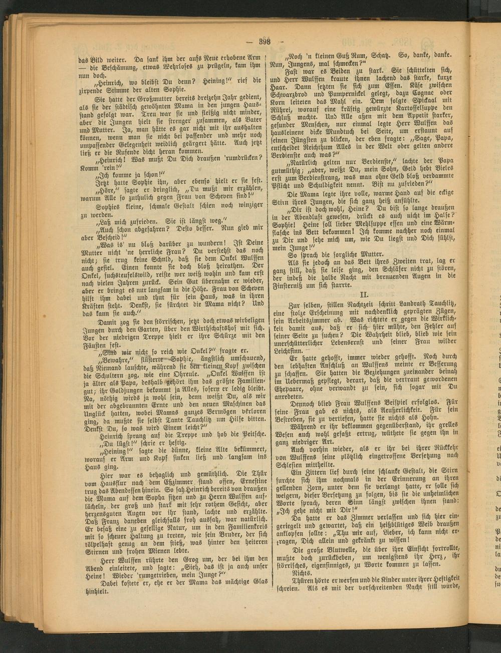 „Was is' nu bloß darüber zu wundern! Ist Deme Mutter nicht 'ne herrliche Frau? Du verstehst das noch nicht- sie trug keine Schuld, daß sie dem Onkel Wulffen auch gefiel. Einen konnte sie doch bloß heirathen. Der Onkel, fuchsteufelswild, reiste wer weiß wohin und kam erst nach vielen Jahren zurück. Sein Gut übernahm er wieder, aber er bringt es nur langsam in die Höhe. Frau von Scheven hilft ihm dabei und thut für sein Haus, was in ihren Kräften steht. Denkst, sie fürchtet die Mama nicht? Und das kann sie auch."