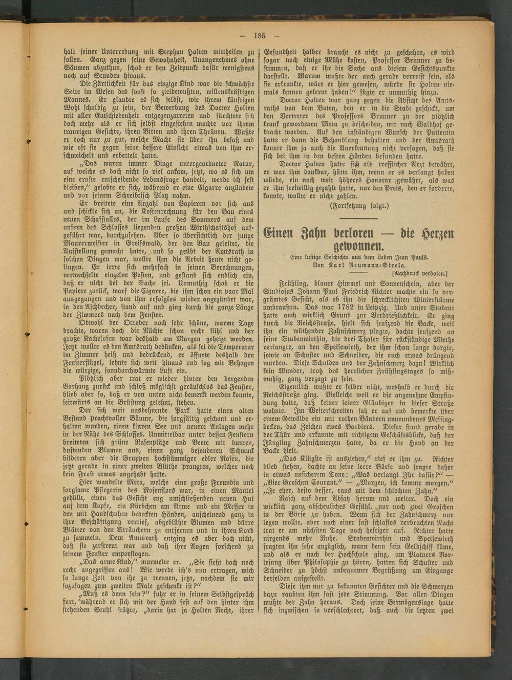 Frühling, blauer Himmel und Sonnenschein, aber der Studiosus Johann Paul Friedrich Richter machte ein" so vergrämtes Gesicht, als ob ihn die schrecklichsten Winterstürme umbrausten. Das war 1782 in Leipzig. Und unser Student hatte auch wirklich Grund zur Verdrießlichkeit. Er ging durch die Reichsstraße, hielt sich seufzend die Backe, weil ihn ein wüthender Zahnschmerz plagte, dachte seufzend an seine Stubenwirthin, die drei Thalcr für rückständige Miethe verlangte, an den Speisewirth, der ihm schon lange borgte, sowie an Schuster und Schneider, die auch etwas drängend wurden. Diese Schulden und der Zahnschmerz dazu! Wirklich kein Wunder, trotz des herrlichen Frühlingstages so miß- muhig, ganz verzagt zu sein.