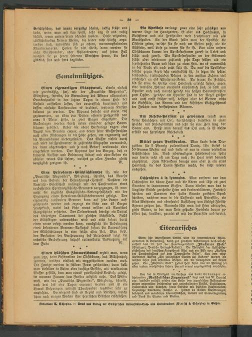 Um Reseda-Parfüm zn gewinnen tränkt man kleine Päuschchen mit Oel, durchschichtet dieselben in einer Flasche mit Resadablüthen und setzt sie eine Zeit lang der Sonne aus. Preßt man darauf das Oel aus, so ist dieses erfüllt von herrlichem Resedaduft.