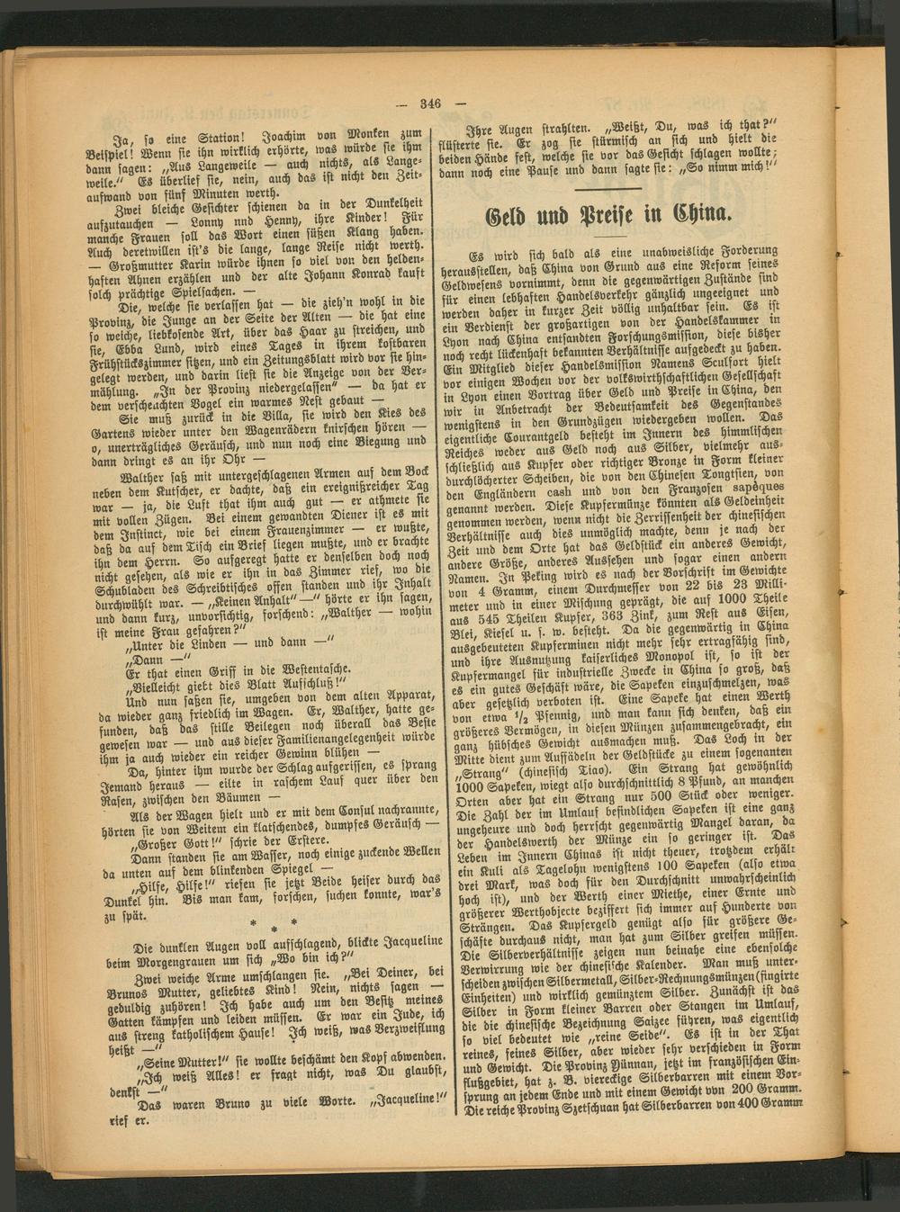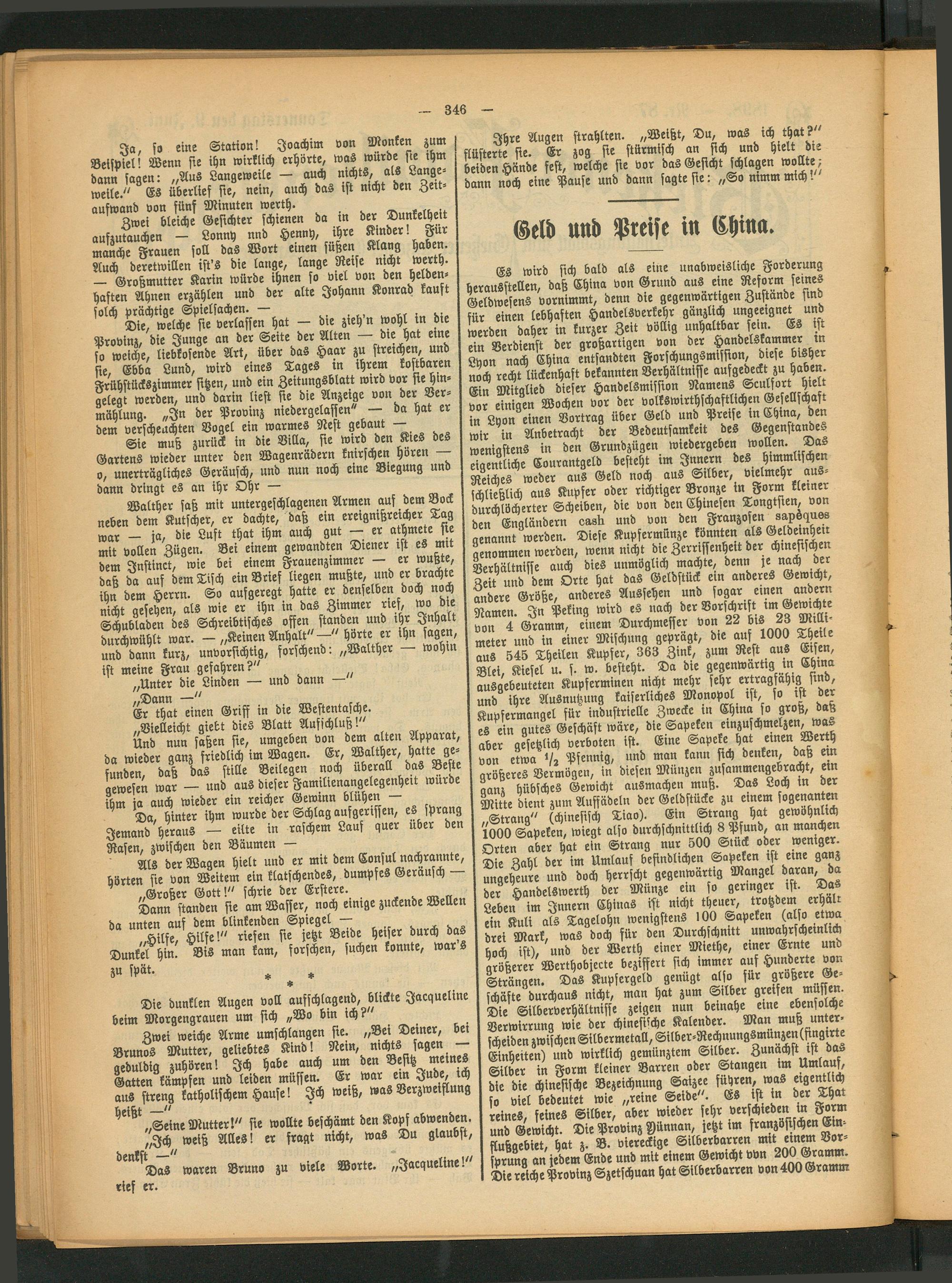 I 1000 Sapeken, wiegt also durchschnittlich 8 Pfund, an manchen Orten aber hat ein Strang nur 500 Stück oder weniger. Die Zahl der im Umlauf befindlichen Sapeken ist eine ganz ungeheure und doch herrscht gegenwärtig Mangel daran, da der Handelswerth der Münze ein so geringer ist. Das ; Leben im Innern Chinas ist nicht theuer, trotzdem erhalt