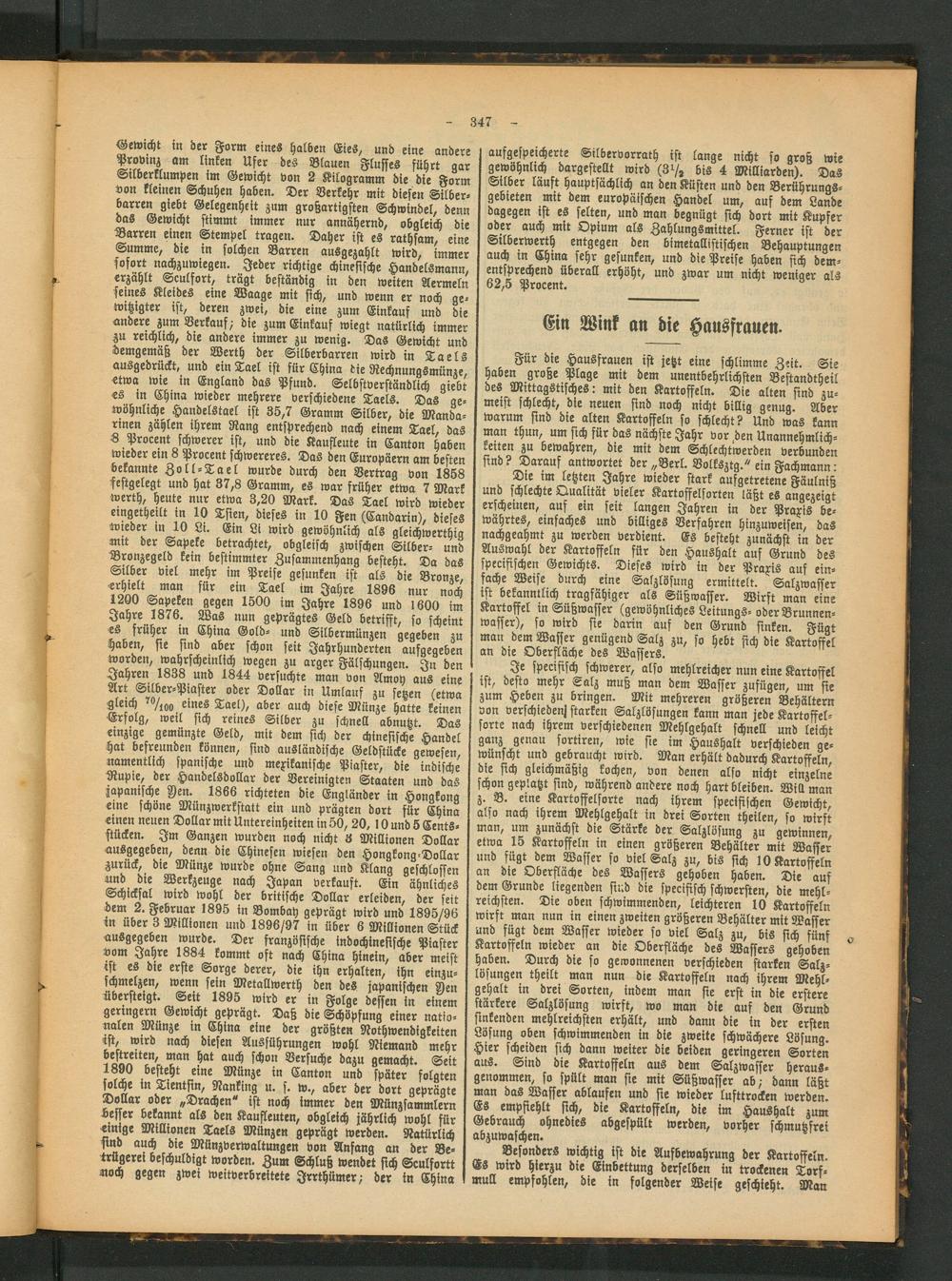 Gewicht in der Form eines halben Eies, und eine andere Provinz am linken Ufer des Blauen Flusses führt qar Srlberklumpen im Gewicht von 2 Kilogramm die die Form von kleinen Schuhen haben. Der Verkehr mit diesen Silberbarren giebt Gelegenheit zum großartigsten Schwindel, denn das Gewicht stimmt immer nur annähernd, obgleich die Barren einen Stempel tragen. Daher ist es rathsam, eine Summe, die in solchen Barren ausgezahlt wird, immer sofort nachzuwiegen. Jeder richtige chinesische Handelsmann, »- erzählt Sculfort, trägt beständig in den weiten Aermeln seines Kleides eine Waage mit sich, und wenn er noch gewitzigter ist, deren zwei, die eine zum Einkauf und die Ändere zum Verkauf,- die zum Einkauf wiegt natürlich immer zu reichlich, die andere immer zu wenig. Das Gewicht und demgemäß der Werth der Silberbarren wird in Taels ausgedrückt, und ein Tael ist für China die Rechnungsmünze etwa wie in England das Pfund. Selbstverständlich giebt es in China wieder mehrere verschiedene Taels. Das gewöhnliche Handelstael ist 35,7 Gramm Silber, die Mandarinen zählen ihrem Rang entsprechend nach einem Tael, das V Procent schwerer ist, und die Kaufleute in Canton haben wieder ein 8 Procent schwereres. Das den Europäern am besten bekannte Zoll-Tael wurde durch den Vertrag von 1858 festgelegt und hat 37,8 Gramm, es war früher etwa 7 Mark werth, heute nur etwa 3,20 Mark. Das Tael wird wieder eingetheilt in 10 Tsien, dieses in 10 Fen (Candarin), dieses wieder in 10 Li. Ein Li wird gewöhnlich als gleichwerthiq mit der Sapeke betrachtet, obgleisch zwischen Silber- und Bronzegeld kein bestimmter Zusammenhang besteht. Da das Silber viel mehr im Preise gesunken ist als die Bronze, für ein Tael im Jahre 1896 nur noch 1200 Sapeken gegen 1500 im Jahre 1896 und 1600 im Jahre 1876. Was nun geprägtes Geld betrifft, so scheint ts früher in China Gold- und Silbermünzen gegeben zu haben, sie sind aber schon seit Jahrhunderten aufgegeben worden, wahrscheinlich wegen zu arger Fälschungen. In den Zähren 1838 und 1844 versuchte man von Amoy aus eine Art Silber-Piaster oder Dollar in Umlauf zu setzen (etwa gleich 70/i00 eines £ae[), aber auch diese Münze hatte keinen Erfolg, weil sich reines Silber zu schnell abnutzt. Das einzige gemünzte Geld, mit dem sich der chinesische Handel hat befreunden können, sind ausländische Geldstücke gewesen namentlich spanische und mexikanische Piaster, die indische Rupie, der Handelsdollar der Vereinigten Staaten und das japanische Yen. 1866 richteten die Engländer in Hongkong eine schöne Münzwerkstatt ein und prägten dort für China einen neuen Dollar mit Untereinheiten in 50, 20, 10 und 5 Cents- stäcken. Im Ganzen wurden noch nicht 3 Millionen Dollar ÄUsgegeben, denn die Chinesen wiesen den Hongkong-Dollar zurück, die Münze wurde ohne Sang und Klang geschlossen "Nd die Werkzeuge nach Japan verkauft. Ein ähnliches Schicksal wird wohl der britische Dollar erleiden, der seit dem 2. Februar 1895 in Bombay geprägt wird und 1895/96 in über 3 Millionen und 1896/97 in über 6 Millionen Stück ausgegeben wurde. Der französische indochinesische Piaster vom Jahre 1884 kommt oft nach China hinein, aber meist tst es die erste Sorge derer, die ihn erhalten, ihn einzu- > schmelzen, wenn sein Metallwerth den des japanischen S)ett übersteigt. Seit 1895 wird er in Folge dessen in einem geringem Gewicht geprägt. Daß die Schöpfung einer nationalen Münze in China eine der größten Nothwendigkeiten ist, wird nach diesen Ausführungen wohl Niemand mehr bereiten, man hat auch schon Versuche dazu gemacht. Seit 1890 besteht eine Münze in Canton und später folgten solche in Tientsin, Nanking u. s. w., aber der dort geprägte Dollar oder „Drachen" ist noch immer den Münzsammlern Lesser bekannt als den Kaufleuten, obgleich jährlich wohl für einige Millionen Taels Münzen geprägt werden. Natürlich k bie Münzverwaltungen von Anfang an der Be