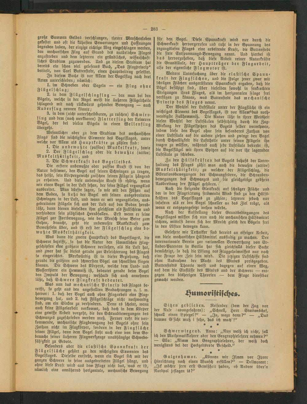 Weitere Untersuchung über die elastische Spannkraft der Flug fläch en, und die Folge jener zwar mit schrägen Flächen ausgerüsteten Spannkraft ergaben, daß die Vögel befähigt sind, über dieselben sowohl in senkrechten Steigungen ihres Fluges, als im horizontalen Fluge frei verfügen zu können, was Buttenstedt das mechanische Prineip des Fluges nennt.