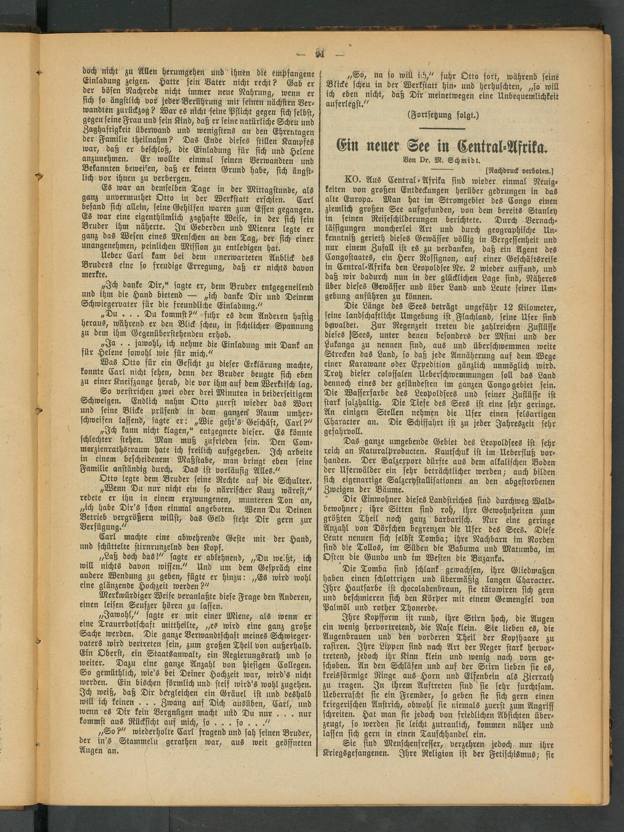 KO. Aus Central - Afrika sind wieder einmal Neuigkeiten von großen Entdeckungen herüber gedrungen in das alte Europa. Man hat im Stromgebiet des Kongo einen ziemlich großen See aufgefunden, von dem bereits Stanley in seinen Retseschilderungen berichtete. Durch Vernachlässigungen mancherlei Art und durch geographische Un- kenntniß gerieth dieses Gewässer völlig in Vergessenheit und nur einem Zufall ist es zu verdanken, daß ein Agent des Congostaates, ein Herr Rossignon, auf einer Geschäftsreise in Central-Afrika den Leopoldsee Nr. 2 wieder auffand, und daß wir dadurch nun in der glücklichen Lage sind, Näheres über dieses Gewässer und über Land und Leute seiner Umgebung anführen zu können.