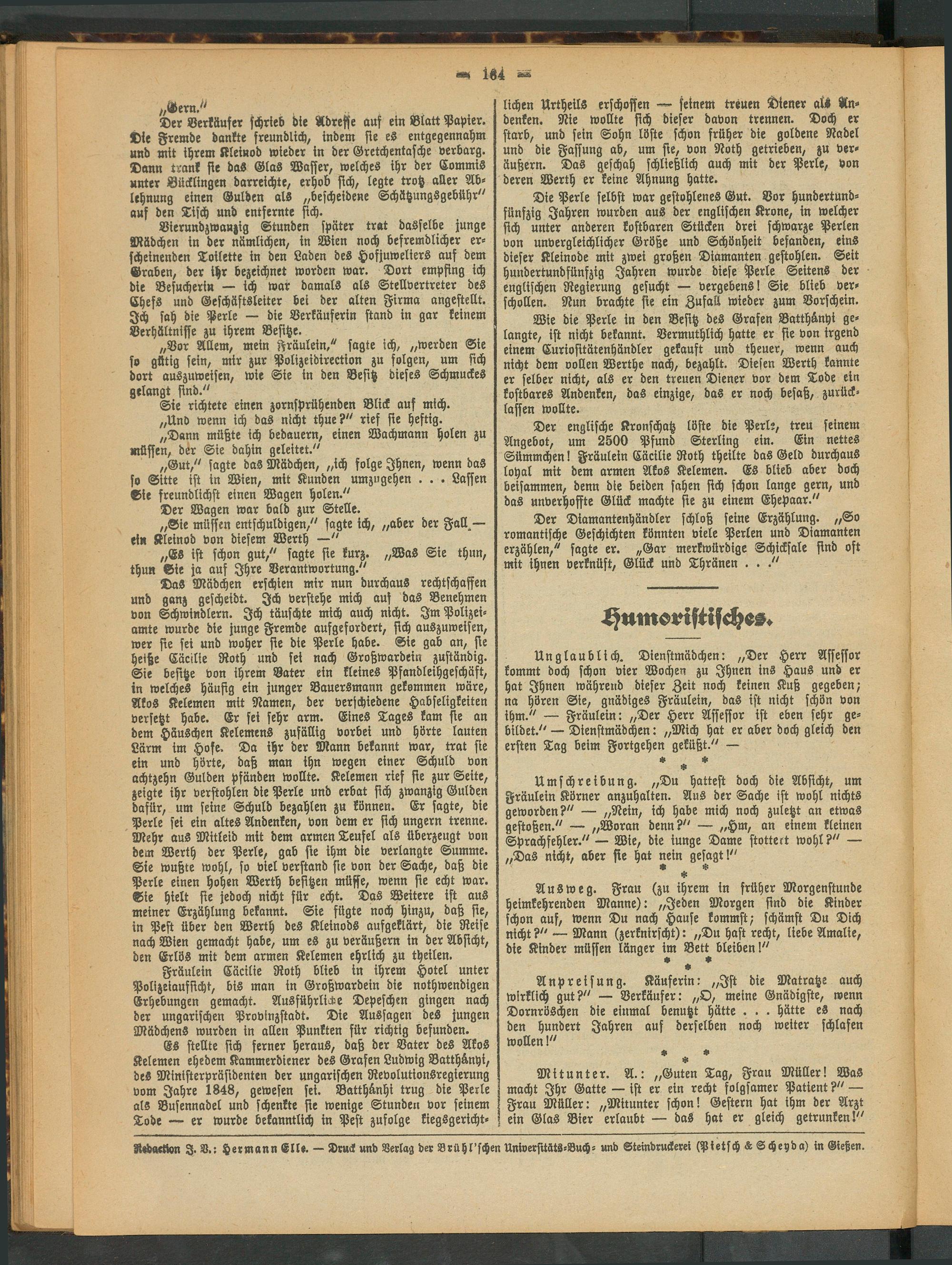 Der englische Kronschatz löste die Perl;, treu seinem Angebot, um 2500 Pfund Sterling ein. Ein nettes Sümmchen! Fräulein Cäcilie Roth theilte das Geld durchaus loyal mit dem armen Akos Kelemen. Es blieb aber doch beisammen, denn die beiden sahen sich schon lange gern, und das unverhoffte Glück machte sie zu einem Ehepaar."