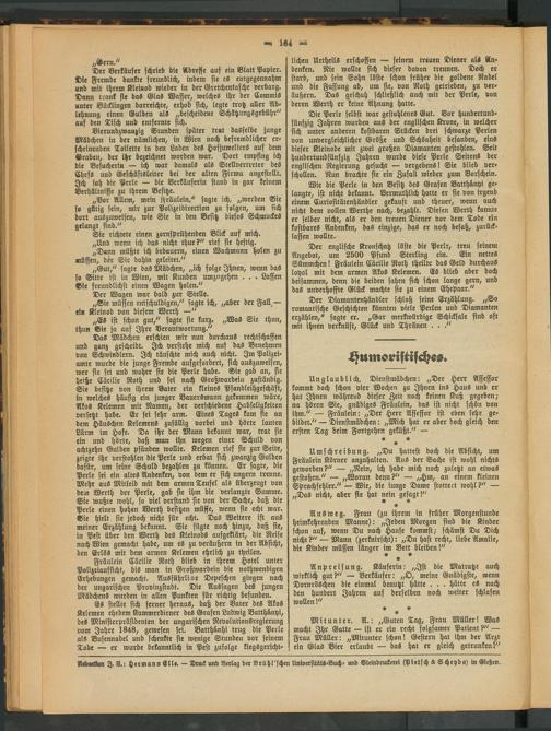 Der Verkäufer schrieb die Adresse auf ein Blatt Papier. Die Fremde dankte freundlich, indem sie es entgegennahm und mit ihrem Kleinod wieder in der Gretchentasche verbarg. Dann trank sie das Glas Waffer, welches ihr der Commis unter Bücklingen darreichte, erhob sich, legte trotz aller Ablehnung einen Gulden als „bescheidene Schätzungsgebühr" auf den Tisch und entfernte sich.