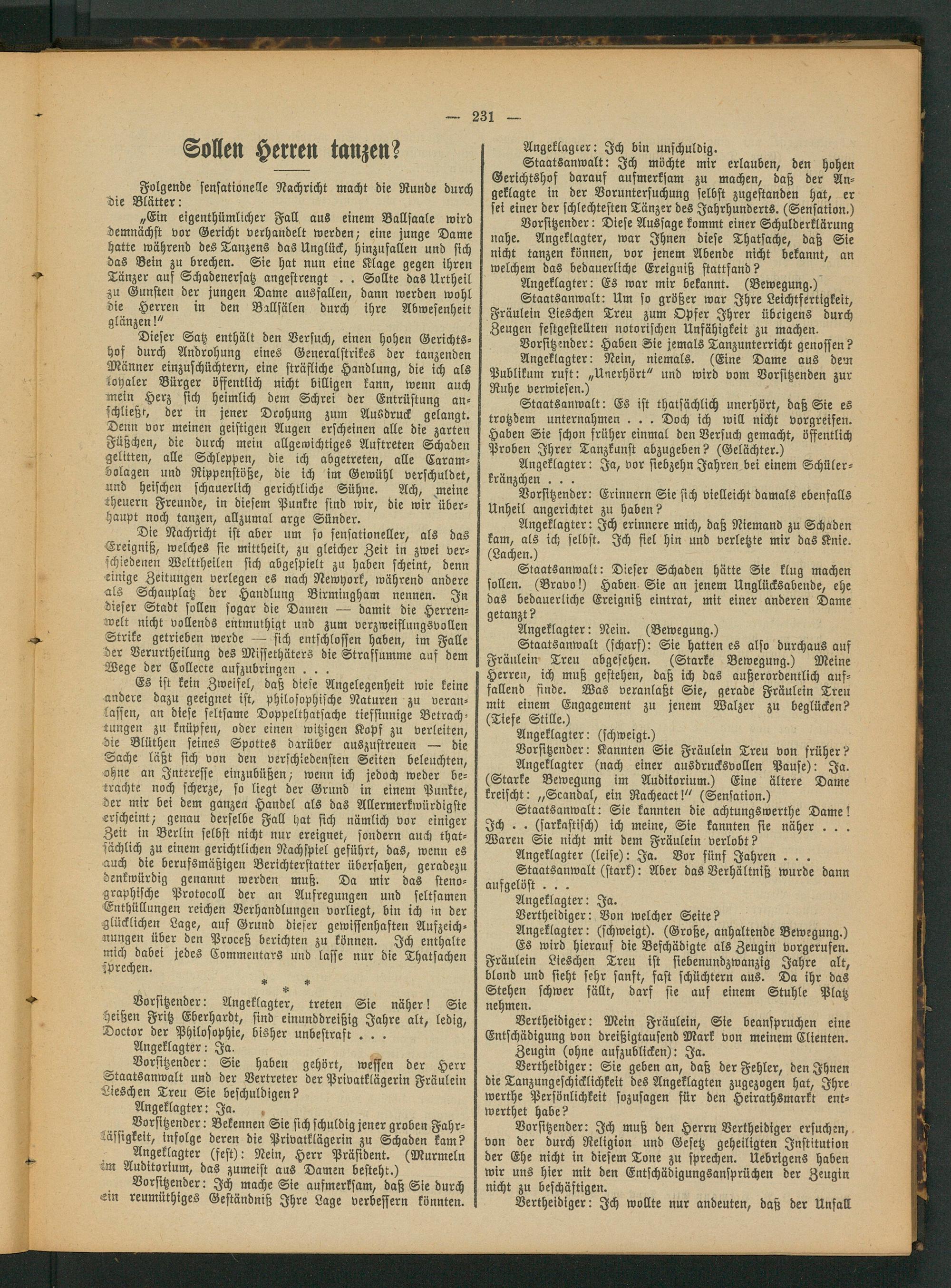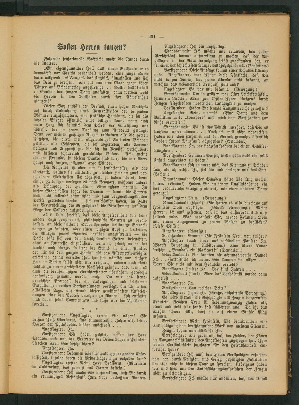 „Ein eigenthümlicher Fall aus einem Ballsaale wird demnächst vor Gericht verhandelt werden- eine junge Dame hatte während des Tanzens das Unglück, hinzufallen und sich das Bein zu brechen. Sie hat nun eine Klage gegen ihren Tänzer auf Schadenersatz angestrengt . . Sollte das Urtheil zu Gunsten der jungen Dame ausfallen, dann werden wohl die Herren in den Ballsälen durch ihre Abwesenheit glänzen!"