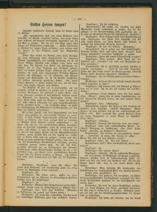 Staatsanwalt: Ich möchte mir erlauben, den hohen Gerichtshof darauf aufmerksam zu machen, daß der Angeklagte in der Voruntersuchung selbst zugestanden hat, er sei einer der schlechtesten Tänzer des Jahrhunderts. (Sensation.)