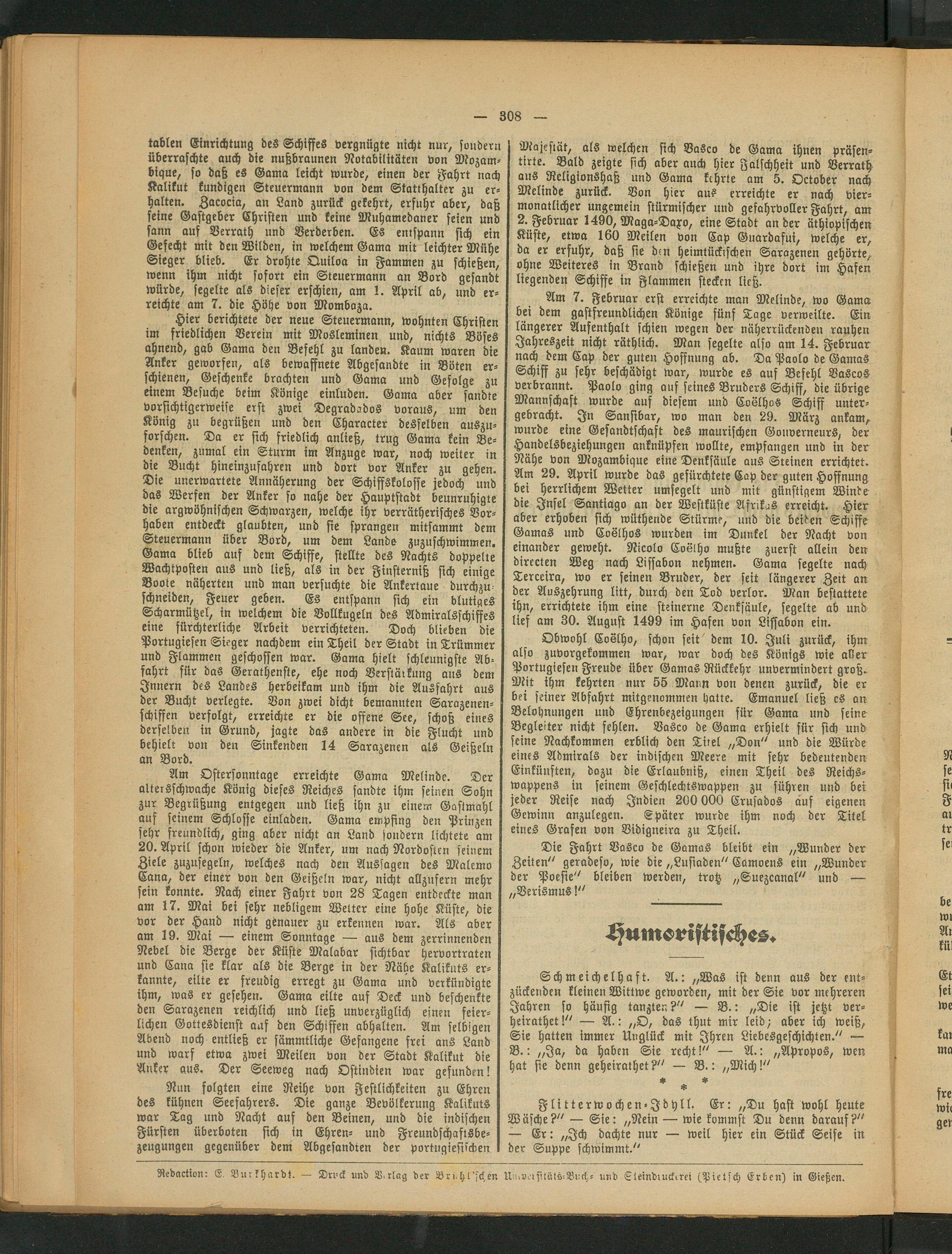 Scharmützel, in welchem die Vollkugeln des Admiralsschiffes eine fürchterliche Arbeit verrichteten. Doch blieben die Portugiesen Sieger nachdem ein Theil der Stadt in Trümmer und Flammen geschossen war. Gama hielt schleunigste Abfahrt für das Gerathenste, ehe noch Verstäikung aus dem Innern des Landes herbeikam und ihm die Ausfahrt aus der Bucht verlegte. Von zwei dicht bemannten Sarazenenschiffen verfolgt, erreichte er die offene See, schoß eines derselben in Grund, jagte das andere in die Flucht und behielt von den Sinkenden 14 Sarazenen als Geißeln an Bord.