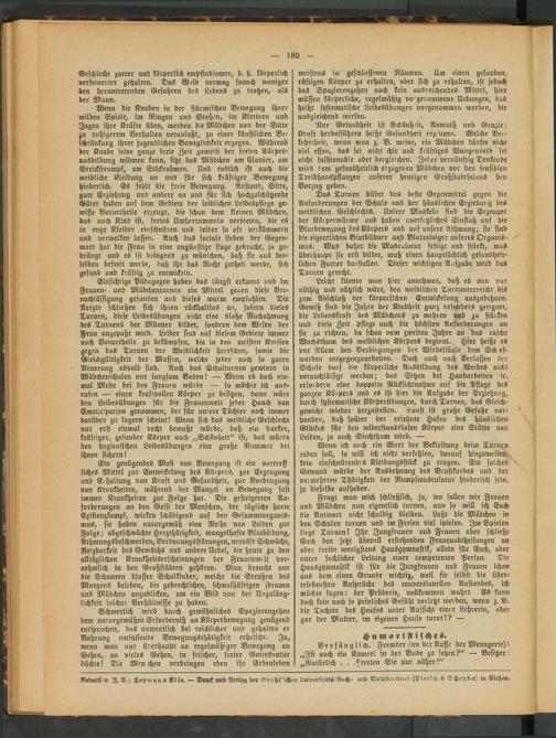 Fragt man mich schließlich, ja, wo sollen wir Frauen und Mädchen nun eigentlich turnen, nun so will ich Euch bie Antwort nicht schuldig bleiben. Laßt die Mädchen in den Schulen turnen und im Freien viel spielen. Im Spielen liegt Turnen! Ihr Jungfrauen und Frauen aber schließt Euch den jetzt überall erstehenden Frauenabtheilungen an oder treibt wenigstens Hausgymnastik, allein für Euch, oder unter fachlicher Leitung einer competenten Person. Die Hausghmnastik ist für die Jungfrauen und Frauen schon aus dem einen Grunde wichtig, weil sie selbst die übertriebensten Ansprüche des conventionellen Anstandes, ich möchte sagen: der Prüderie, vollkommen wahrt. Es kann doch kein noch so peinliches Gefühl verletzt werden, wenn z. B. die Tochter des Hanfes unter Aussicht einer Lehrerin, oder gar der Mutter, im eigenen Hause turnt!? —