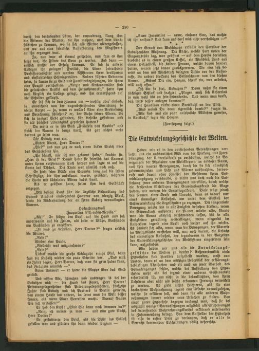 Wie haben wir uns also die Entwickelungsgeschichte der Welten zu denken? Außerordentlich viele Hypothesen sind hierüber aufgestellt worden, meist von Leuten, denen es an dem nöthigen Ueberblick der erklärungsbedürftigen Thatsachen und ost auch an jener Klarheit des Gedankenganges fehlte, welche bei Ausstellung von Hypothesen mehr' als bei irgend einer anderen Geistesarbeit erforderlich ist, um nicht in die bedenklichsten, von ihren Urhebern aber nicht als solche erkannten Irrwege verwickelt zu werden. Es giebt nichts Leichteres, als für, eine beobachtete Wahrnehmung irgend eine Ursache vorauszusetzen, welche sie erklären soll, und dann sür alle anderen Wahrnehmungen immer wieder neue Ursachen zu finden. Von einer guten Hypothese dagegen verlangt man, daß sie bei möglichst wenigen Voraussetzungen möglichst alle Erscheinungen des betreffenden Wahrnehmungskreises erklärend miteinander in Zusammenhang bringt. Von dem Aussteller der Hypothese ist also in erster Linie zu verlangen, daß er alle in Betracht kommenden Erscheinungen völlig beherrscht.
