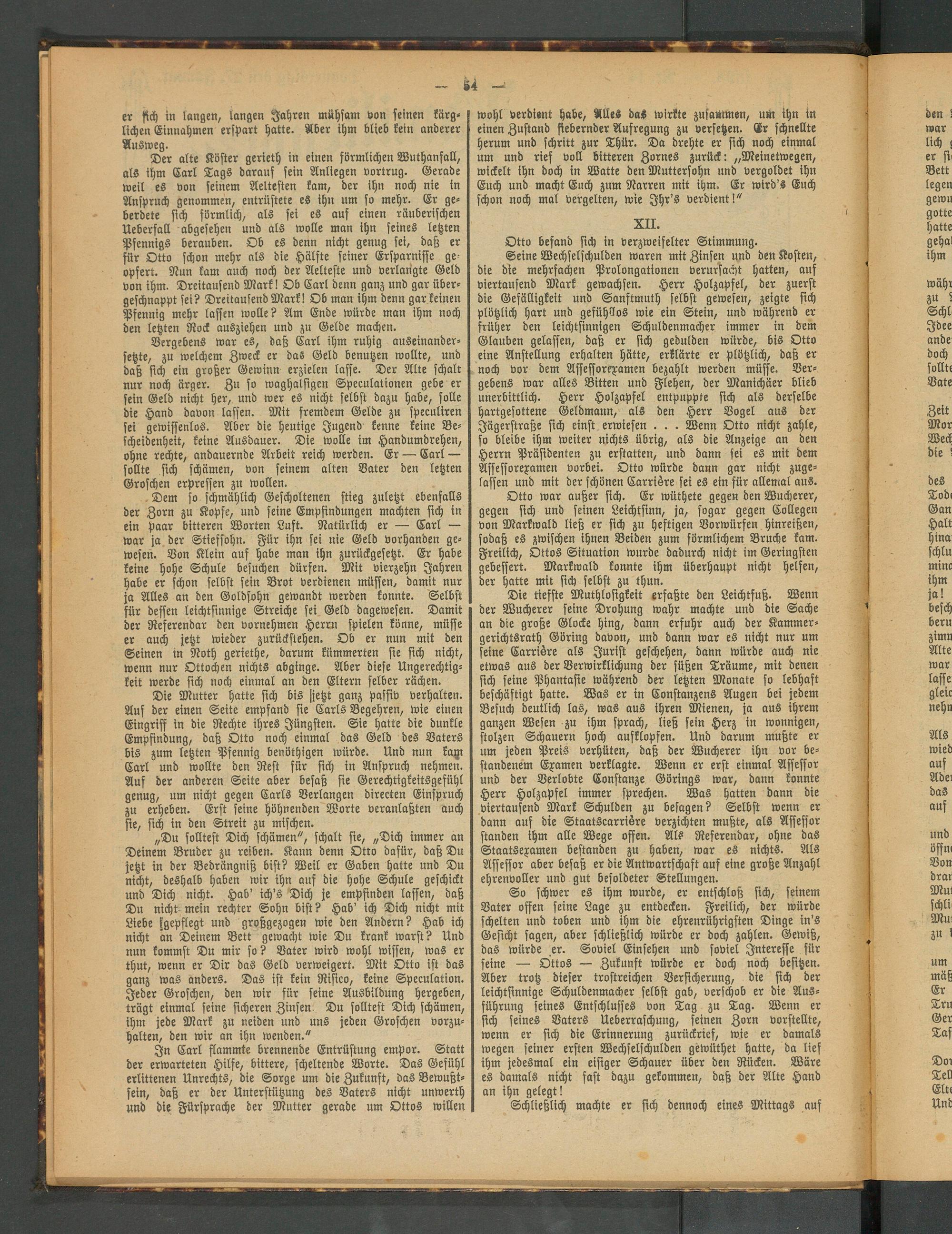 Die Mutter hatte sich bis jjetzt ganz Passiv verhalten. Auf der einen Seite empfand sie Carls Begehren, wie einen Eingriff in die Rechte ihres Jüngsten. Sie hatte die dunkle Empfindung, daß Otto noch einmal das Geld des Vaters bis zum letzten Pfennig benöthigen würde. Und nun lagt Carl und wollte den Rest für sich in Anspruch nehmen. Auf der anderen Seite aber besaß sie Gerechtigkeitsgefühl genug, um nicht gegen Carls Verlangen directen Einspruch zu erheben. Erst seine höhnenden Worte veranlaßten auch sie, sich in den Streit zu mischen.