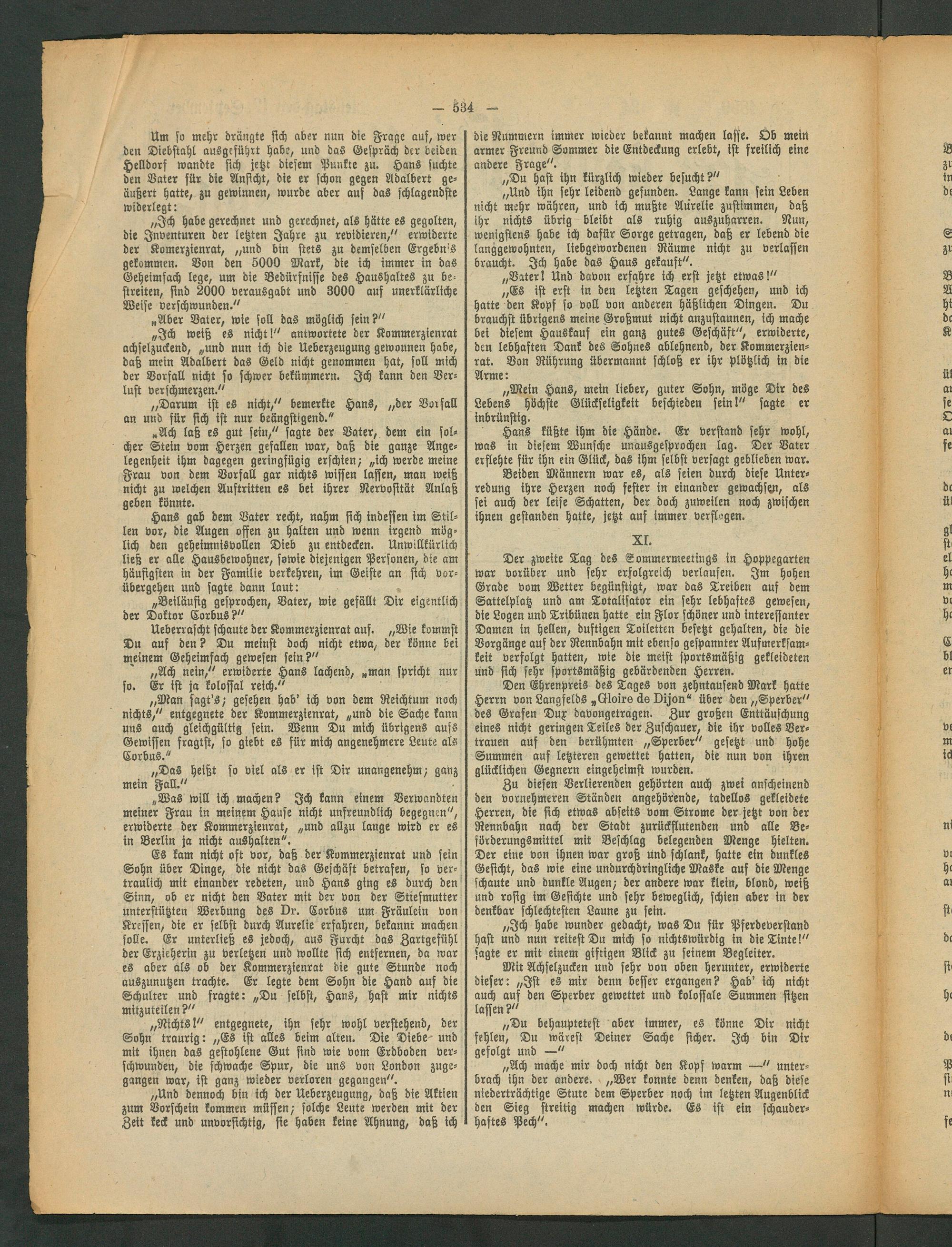 Es kam nicht oft vor, daß der Kommerzienrat und sein Sohn über Dinge, die nicht das Geschäft betrafen, so vertraulich mit einander redeten, und Hans ging es durch den Sinn, ob er nicht den Vater mit der von der Stiefmutter unterstützten Werbung des Dr. Corbus um Fräulein von Kressen, die er selbst durch Aurelie erfahren, bekannt machen solle. Er unterließ es jedoch, aus Furcht das Zartgefühl der Erzieherin zu verletzen und wollte sich entfernen, da war es aber als ob der Kommerzienrat die gute Stunde noch auszunutzen trachte. Er legte dem Sohn die Hand auf die Schulter und fragte: „Du selbst, Hans, hast mir nichts mitzuteilen?"