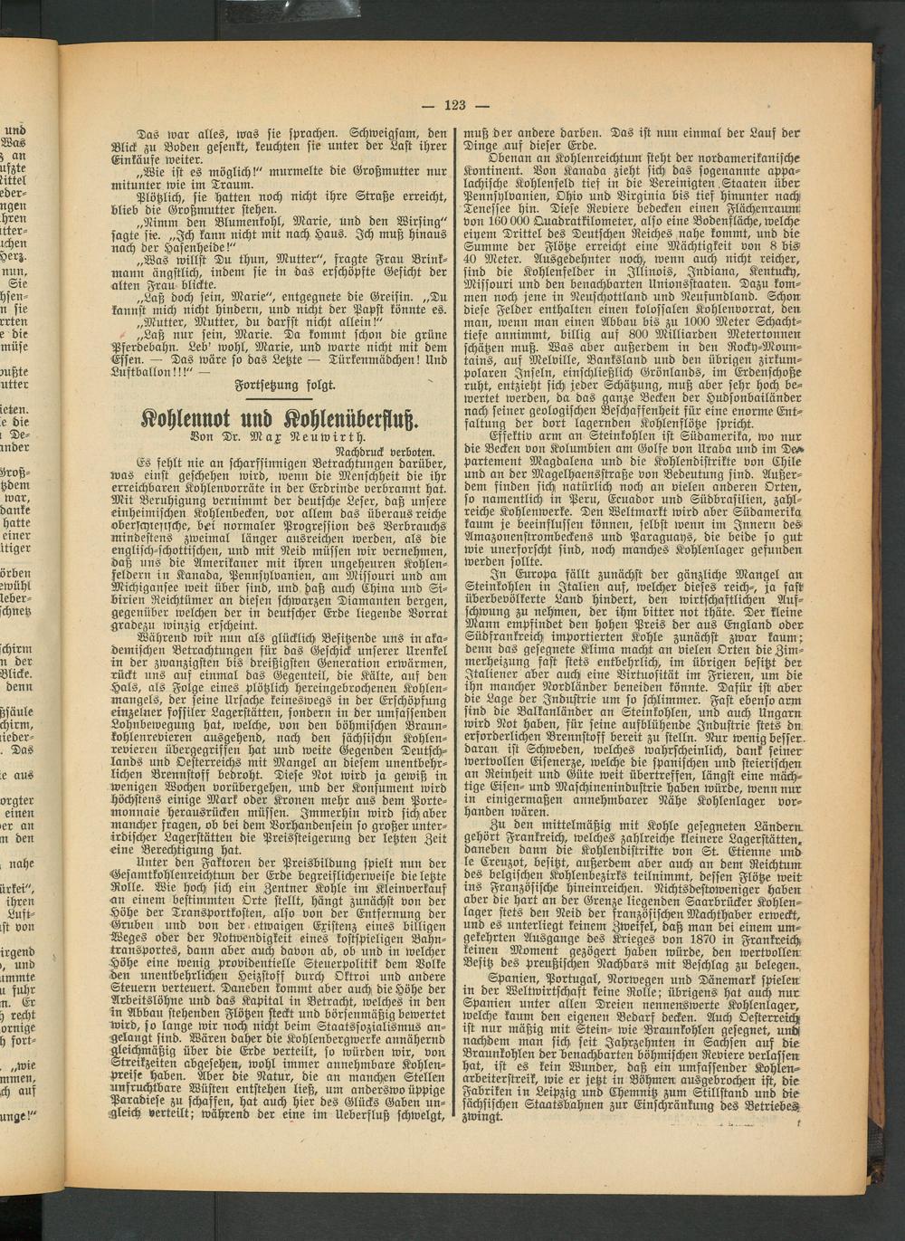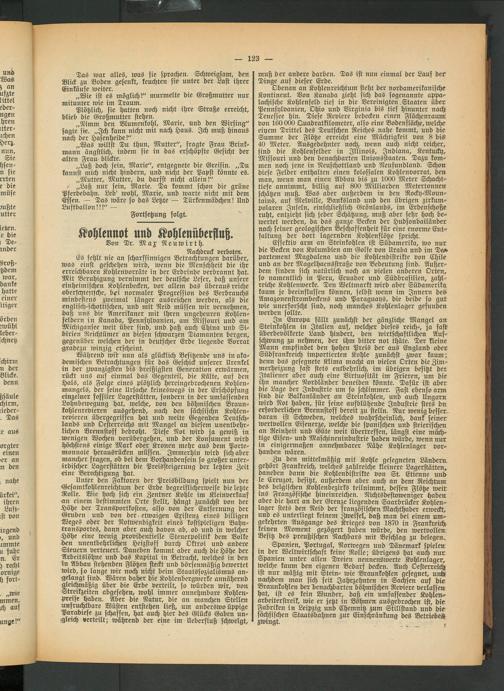 Während wib nun als glücklich Besitzende uns in akademischen Betrachtungen für das Geschick unserer Urenkel in der zwanzigsten bis dreißigsten Generation erwärmen, rückt uns auf einmal das Gegenteil, die Kälte, auf den Hals, als Folge eines plötzlich hereingebrochenen Kohlen- mangels, der seine Ursache keineswegs in der Erschöpfung einzelner fossiler Lagerstätten, sondern in der umfassenden Lohnbewegung hat, welche, von den böhmischen Braunkohlenrevieren ausgehend, nach den sächsischn Kohlenrevieren übergegriffen hat und weite Gegenden Deutschlands und Oesterreichs mit Mangel an diesem unentbehrlichen Brennstoff bedroht. Diese Not wird ja gewiß in wenigen Wochen vorübergehen, und der Konsument wird höchstens einige Mark oder Kronen mehr aus dem Portemonnaie herausrücken müssen. Immerhin wird sich aber mancher fragen, ob bei dem Vorhandensein so großer unterirdischer Lagerstätten die Preissteigerung der letzten Zeit eine Berechtigung hat.