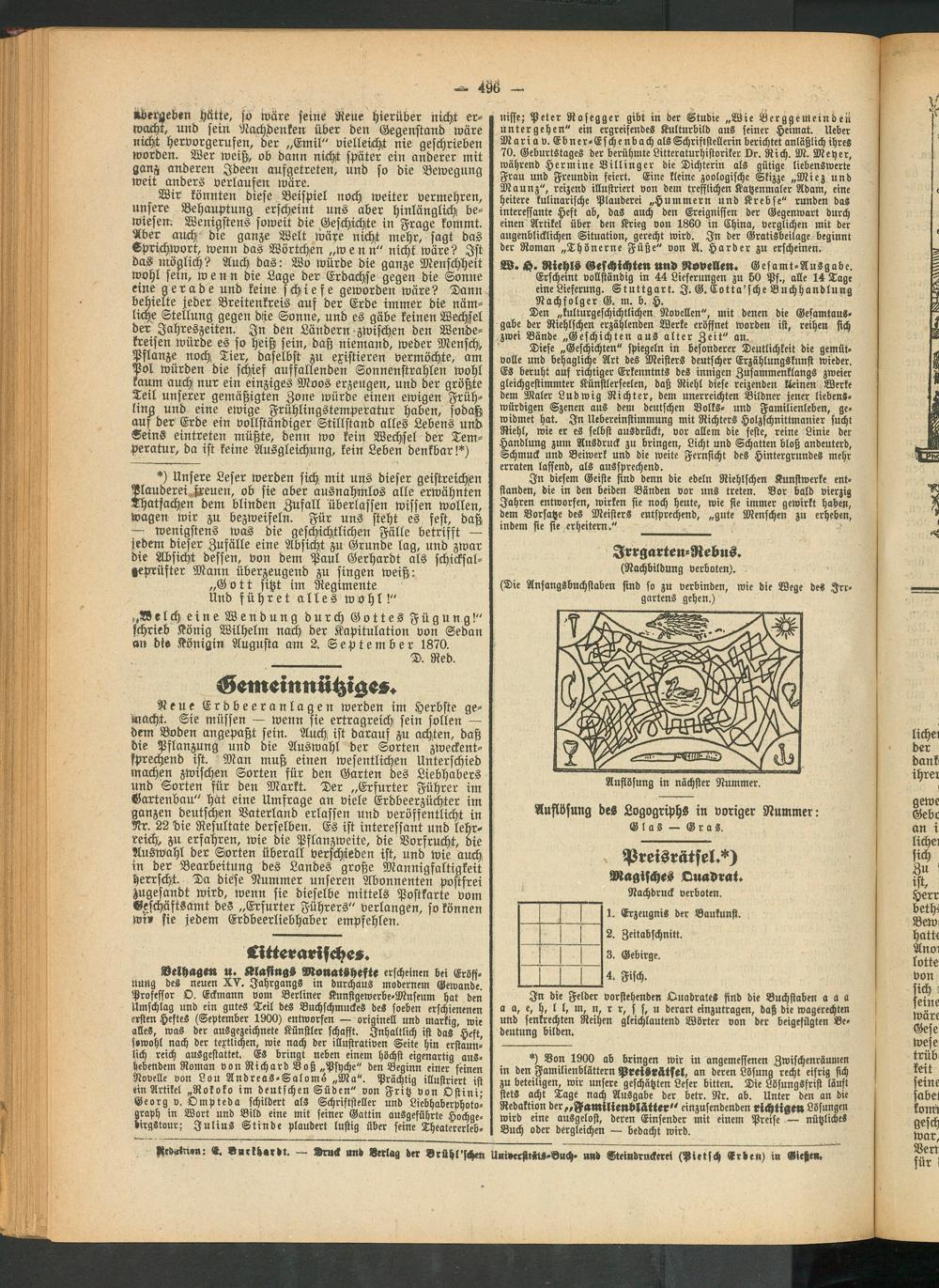 nisse; Peter Rosegger gibt in der Studie „Wie Berggenteinden untergehen" ein ergreifendes Kulturbild aus seiner Heimat, lieber Mari av. Ebner-Eschenbach als Schriftstellerin berichtet anläßlich ihres 70. Geburtstages der berühmte Litteraturhistoriker Dr. Rich. M. Meyer, während Hermine Dillinger die Dichterin als gütige liebenswerte Frau und Freundin feiert. Eine kleine zoologische Skizze „Miez und Maunz", reizend illustriert von dem trefflichen Katzenmaler Adam, eine heitere kulinarische Plauderei „Hummern und Krebse" runden das interessante Heft ab, das auch den Ereignissen der Gegenwart durch einen Artikel über den Krieg von 1860 in China, verglichen mit der augenblicklichen Situation, gerecht wird. In der Gratisbeilage beginnt der Roman „Thönerne Füße" von A. Harder zu erscheinen.