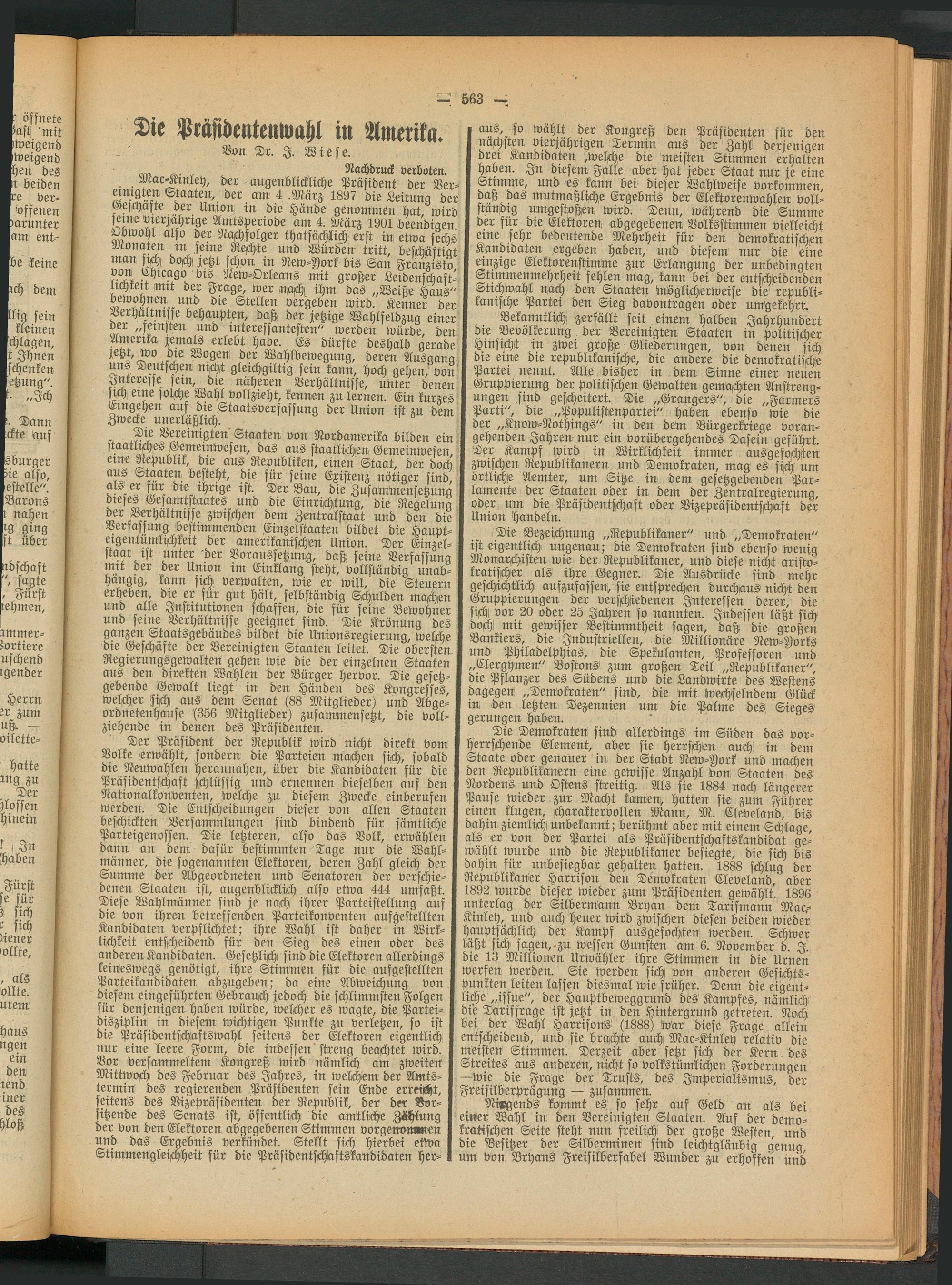 Mac^Krntey, der augenblickliche Präsident der Ver- eimgten Staaten, der am 4 .März 1897 die Leitung der Geschäfte der Union in die Hände genommen hat wird seine vierjährige Amtsperiode am 4. März 1901 beendigen. Obwohl also der Nachfolger thatsäMch erst in etwa sechs Monaten in feine Rechte und Würden tritt, beschäftigt man sich! doch petzt schon in New-York bis San Franzisko öov! Ehieago ' bis New-Orleans mit großer Leidenschaftlichkeit mit der Frage, wer nach; ihm das „Weiße Haus" bewohnen und die Stellen vergeben wird. Kenner der Verhältnisse behaupten, daß der jetzige Wahlfeldzug einer oer „feinsten und interessantesten" werden würde, den Amerita pemals erlebt habe. Es dürfte deshalb gerade petzt, wo die Wogen der Wahlbewegung, deren Ausgang uns deutschen nicht gleichgiltig sein kann, hoch gehen, von Interesse fern, die näheren Verhältnisse, unter denen sVh. eine solche Wahl vollzieht, kennen zn lernen. Ein kurzes ^"gehen aus dw Staatsverfassung der Union ist zu dem Zwecke unerläßlich. 0