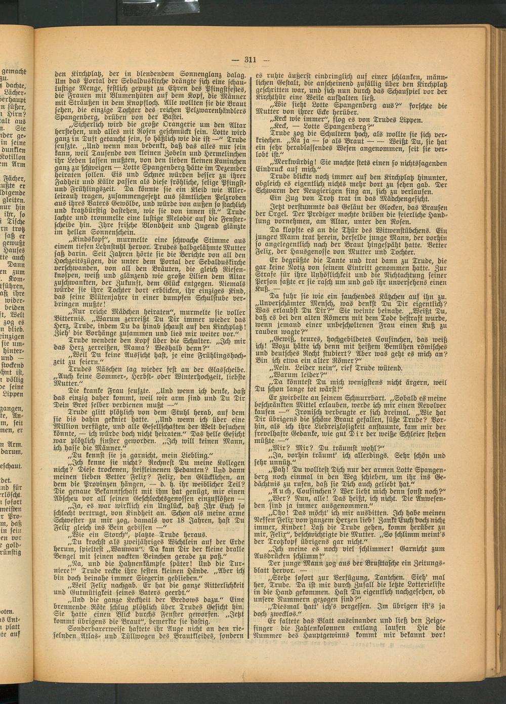 „Kindskopf", murmelte eine schwache Stimme aus einem tiefen Lehnstuhl hervor. Trudes halbgelähmte Mutter saß darin. Seit Jahren hörte sie die Berichte von all den Hochzeitszügen, die unter dem Portal der Sebalduskirche verschwanden, von all den Bräuten, die gleich Riesenknospen, weiß und glänzend wie große Lilien dem Altar zuschwankten, der Zukunft, dem Glück entgegen. Niemals würde sie ihre Tochter dort erblicken, ihr einziges Kind, das seine Blütenjahre in einer dumpfen Schulstube verbringen mußte!